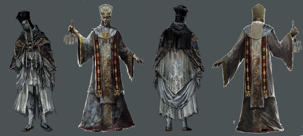 In all likelihood, the Profaned Capital had once been a small country of little note, following the Way of Blue or some such. It may not have even had a king, as Yhorm’s palace has the same floor tile seen in the church. Since this ornate but nondescript design is also used for the Cathedral of the Deep and later reused for shrine areas in the Ringed City, it could just be a generic asset for fancy flooring, but the common theme of religiosity suggests at least some similar association for the palace. If it was originally just another religious building, then that would leave the country’s administration to the church and noble class confirmed by the Aristocrat’s Mask — and if DS1’s Thorolund is any indication, the two must have been deeply intertwined. But the theocracy evolved as the noble priests began embracing sorcery, forgoing faith for intellect. No longer did they rule in the name of the gods but of their own wisdom; it was them whom the masses should glorify. What caused this dramatic cultural shift, or rather, who?