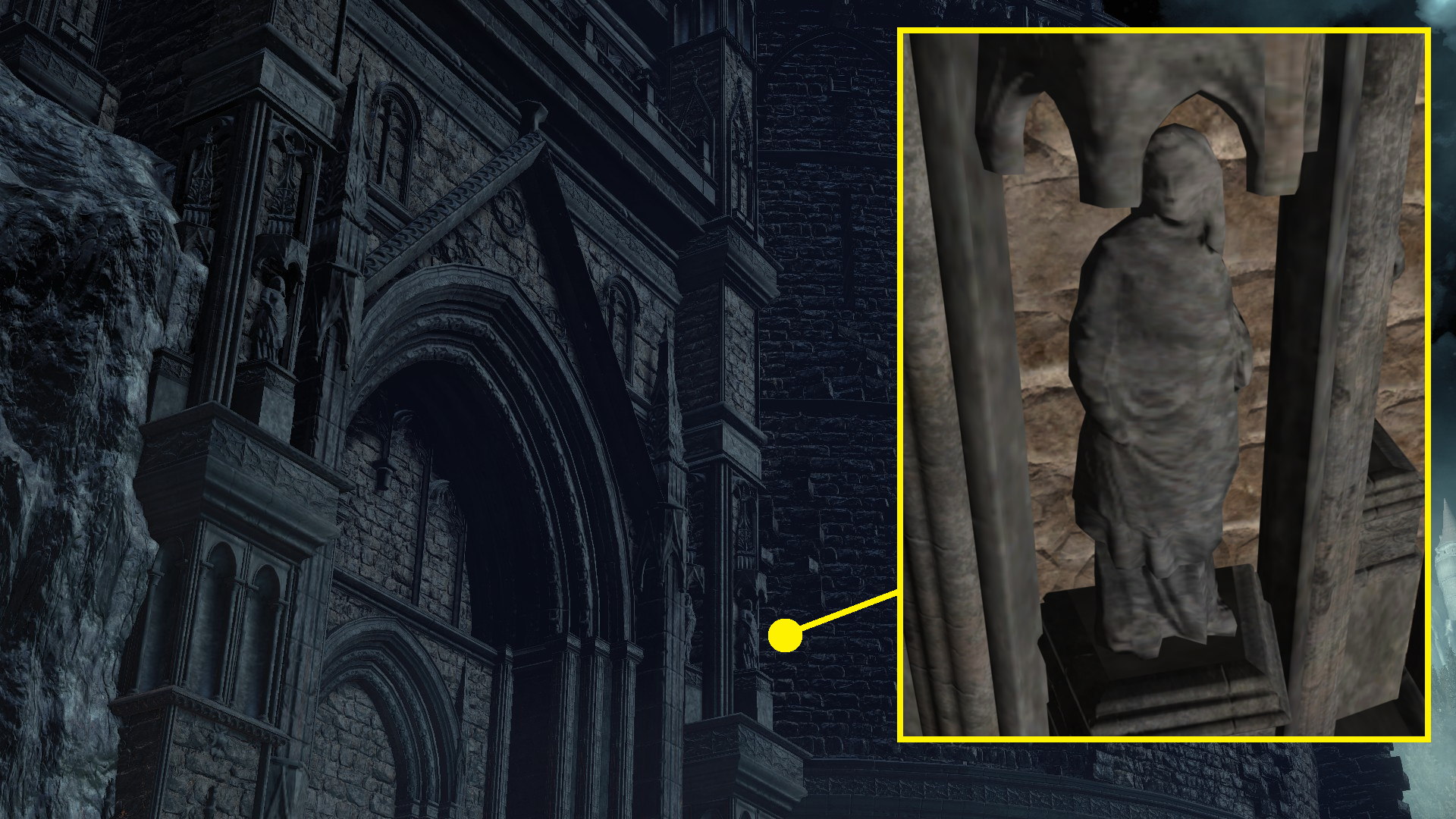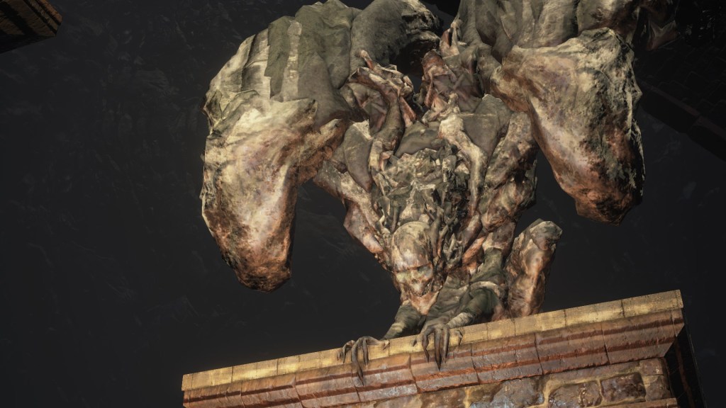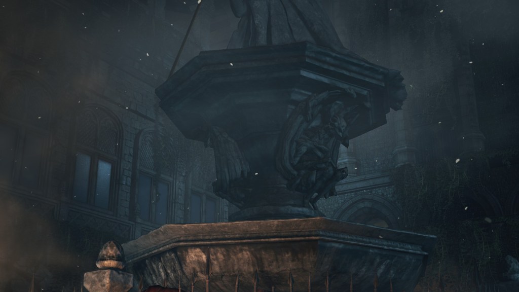The Capital’s gargoyles also guard the rooftops of Lothric’s Grand Archives. It makes sense for the Scholars to keep them for study as they do with other magical artifacts, but we can also find their image carved into the base for Prince Lothric’s statue in the city below; an identical base for a beheaded knight statue, implicitly in another part of the city, can similarly be spotted at the Dreg Heap. Even if we assume the second example is simply reusing assets for DLC, why would King Oceiros include them in propaganda for his son? In truth, much like the statue itself, this iconography is a vestige of an older concept, as evidenced by the enemy’s internal name “royal castle gargoyle” (王城のガーゴイル) implicating creation by Lothric Castle in the initial concept. However, in the context of the final game, they would be included for the same reason as the prince’s greatsword and jewelry: to pay tribute to Pontiff Sulyvahn. As a previous visitor to the Profaned Capital and ally of Oceiros, he is the perfect bridge for the Scholars acquiring the gargoyles, and they wouldn’t be the only specimens he collected from there.