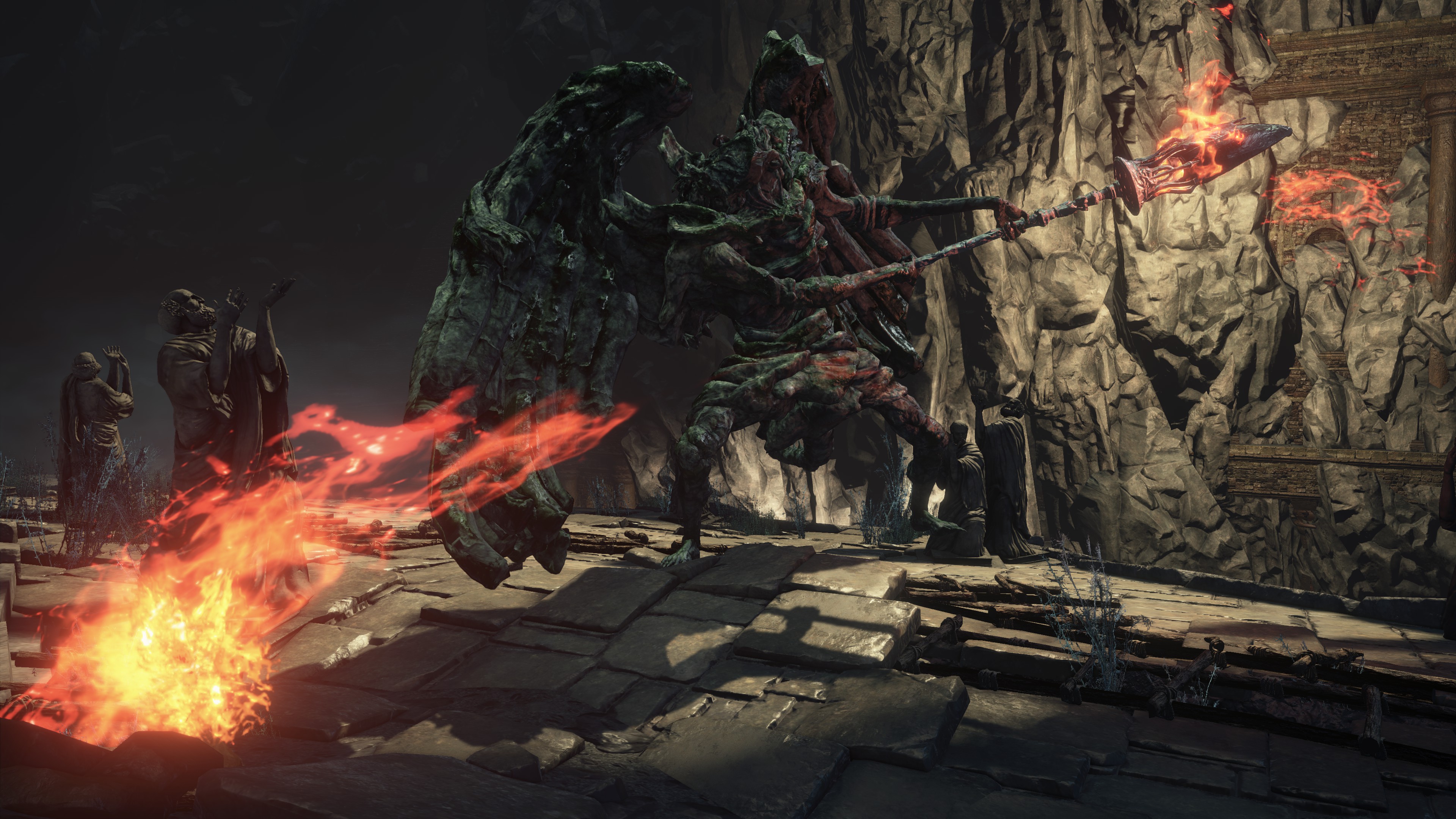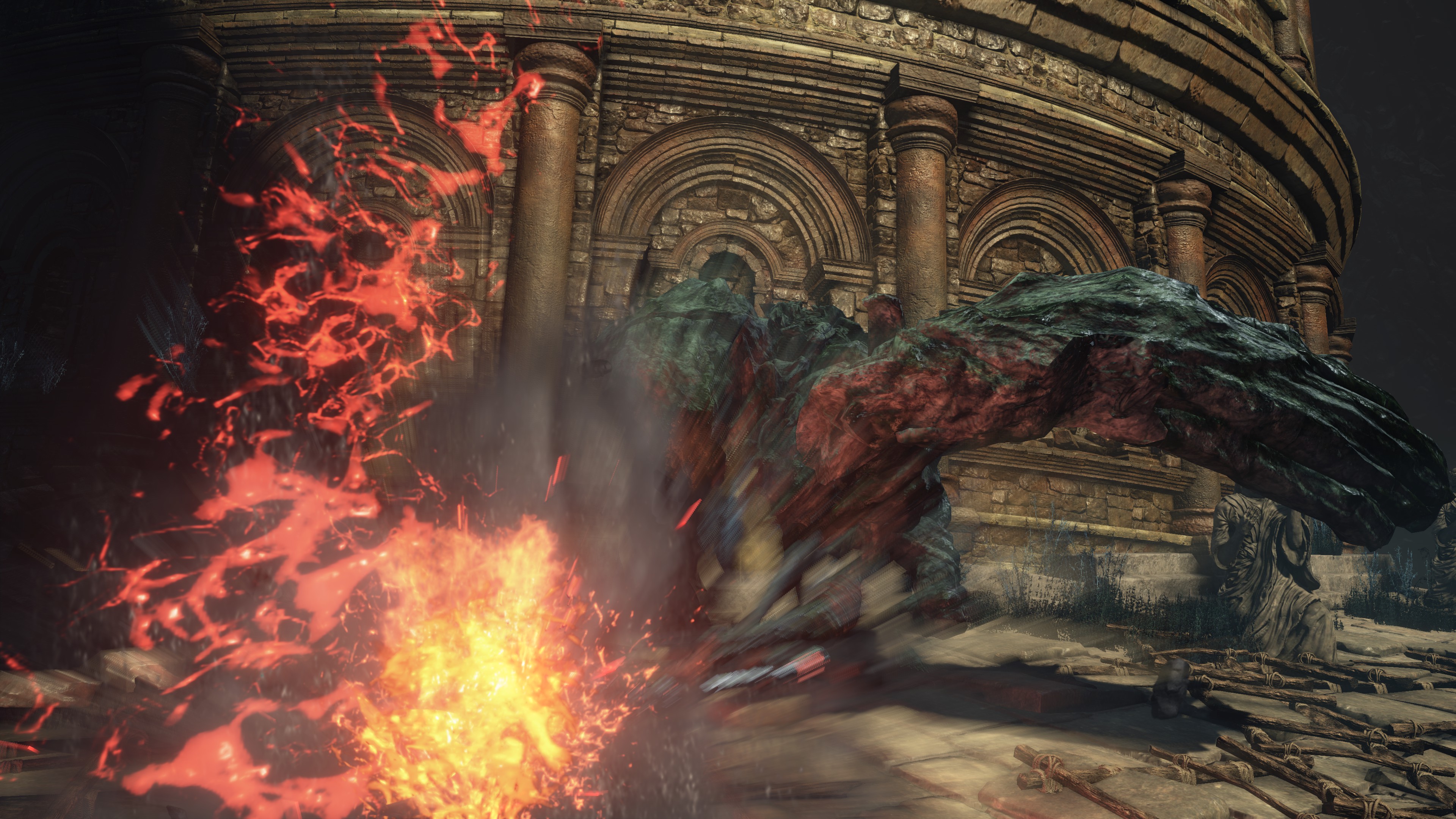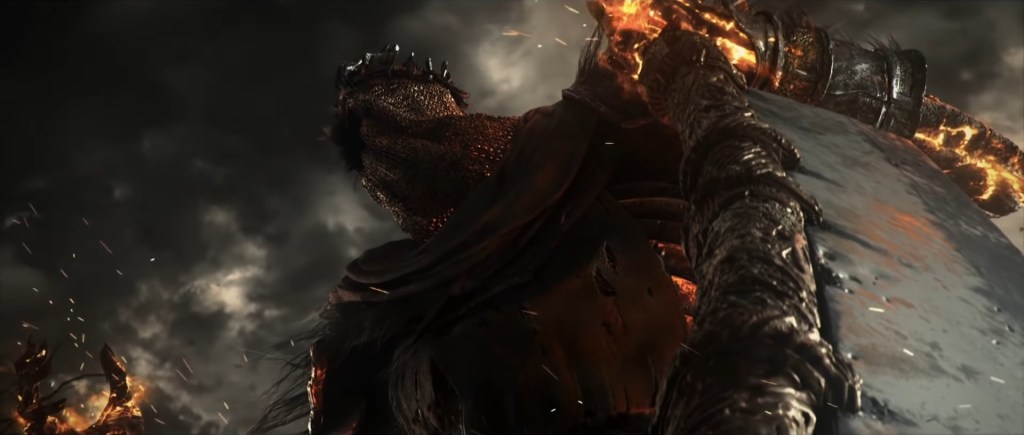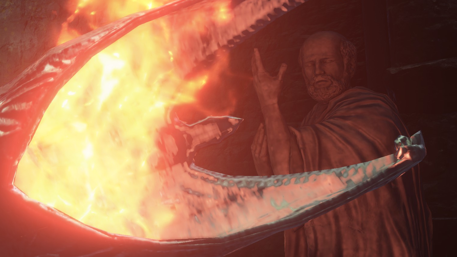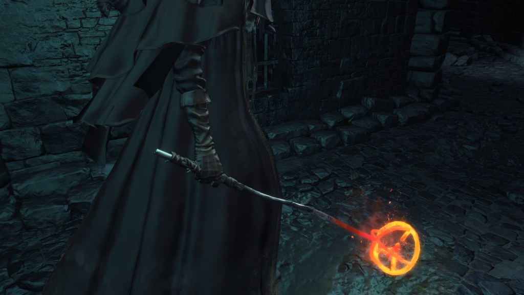 The Abyss has sparked flames before, but these are typically black flames bearing similar properties to their source of power: humanity. By contrast, the Profaned Flame still appears no different from your standard fire, and anything relying on its power deal solely fire damage, not dark damage like black flame pyromancies. Likewise, the gargoyles’ stone weapons double as torches for the Profaned Flame, the fire melting the rock to produce lava — as we can hear bubbling from within the weapons and see spilling out during some of the gargoyles’ attacks — in spite of its apparent lack of heat. Perhaps black flames too are perversely cold, but they certainly don’t rival Chaos in strength. The only other quality associating this fire with the Dark is its supposed inability to be extinguished. The one we can give Andre has evidently been burning in that skull as is without change, and we can see that the burnt corpses in the Capital still retain embers at minimum. If left untouched, these vestiges of flame likely really would never go out, much like how bearers of the Darksign would never die.
