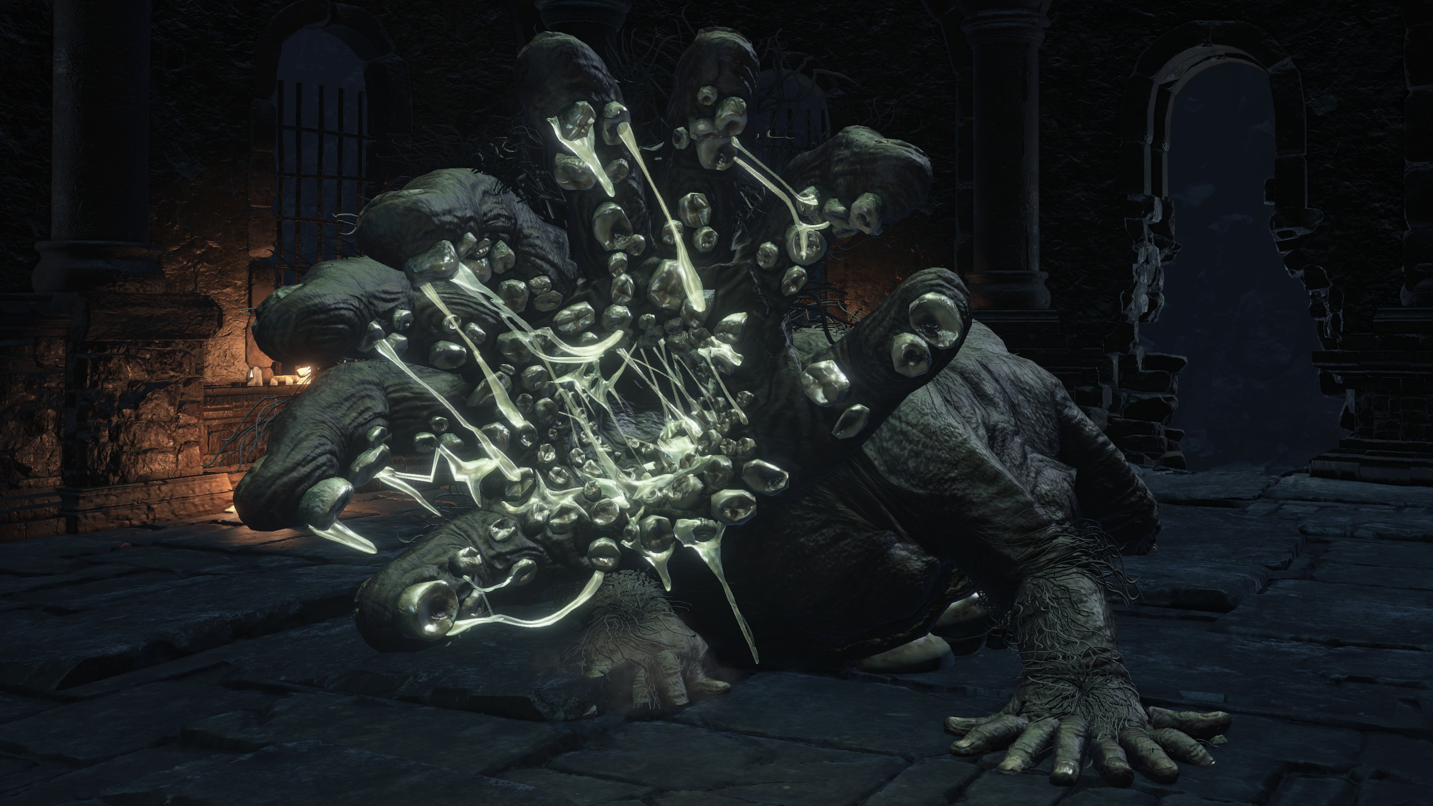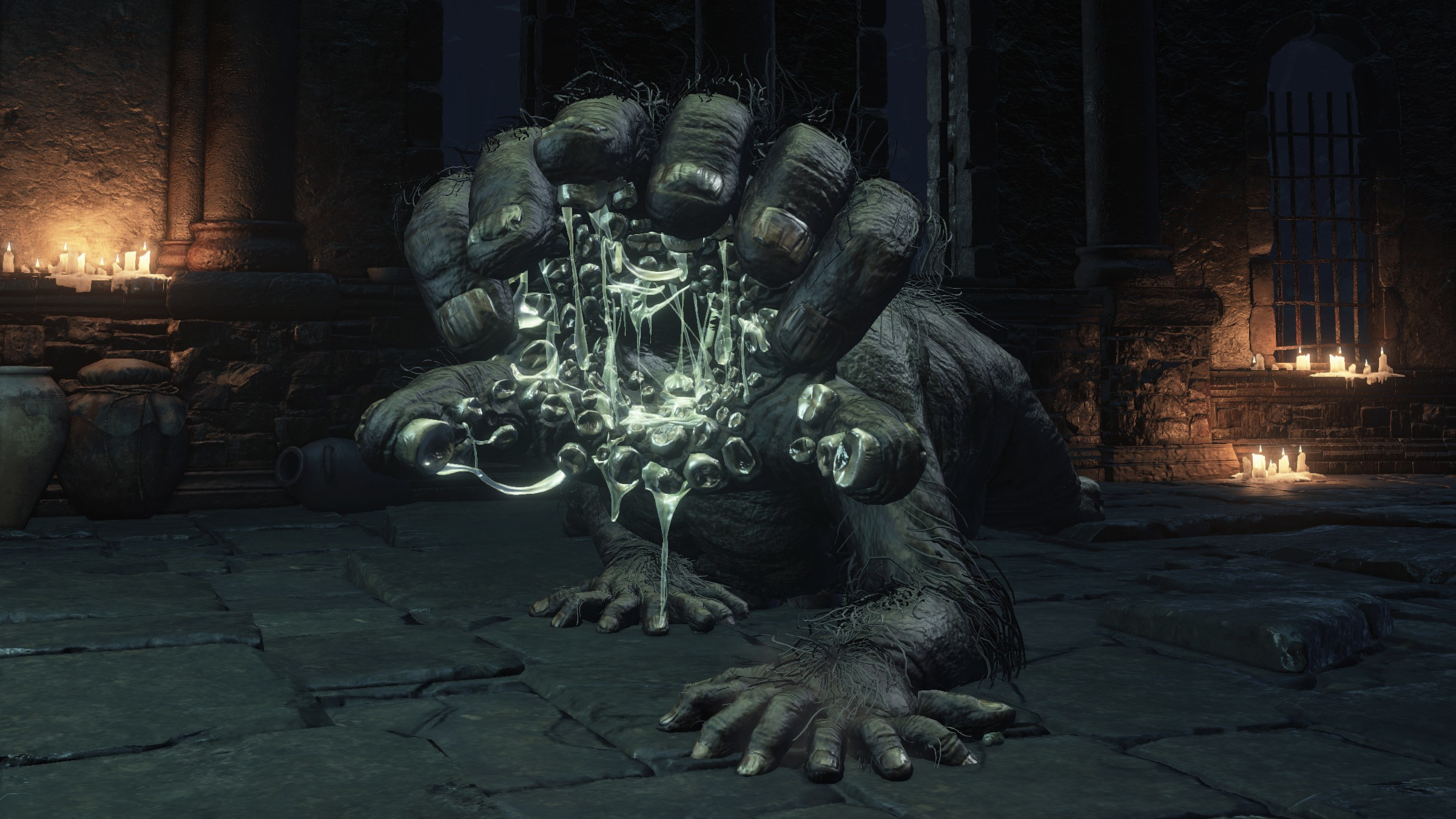 With all this in mind, it is only natural that Logan’s successors be the ones to create such a peculiar flame. According to Eleonora’s description, a curse afflicting women of one priest’s family was the trigger to its genesis. This curse transformed them into grotesque monstrosities with charcoal skin, overweight frames, unkempt body hair, short tails, three-toed feet, bellies crammed with dozens of eyes, and third hands for heads. These three hands are gaping maws with teeth sloppily growing out across the palms and fingers, absorbing some of our souls should we be grabbed and gnawed on. Although reminiscent of the left hand of Manus, these women with ravenous appetites don’t seem to be your typical product of abyssal corruption, since the Wolf Knight’s Greatsword has no effect. Rather, these “grotesques of sin” (罪の異形) are the result of something slightly different than a plain Dark curse, just like the Fire of Sin they spawned. And the most likely cause for these underlying differences is Eleonora itself.