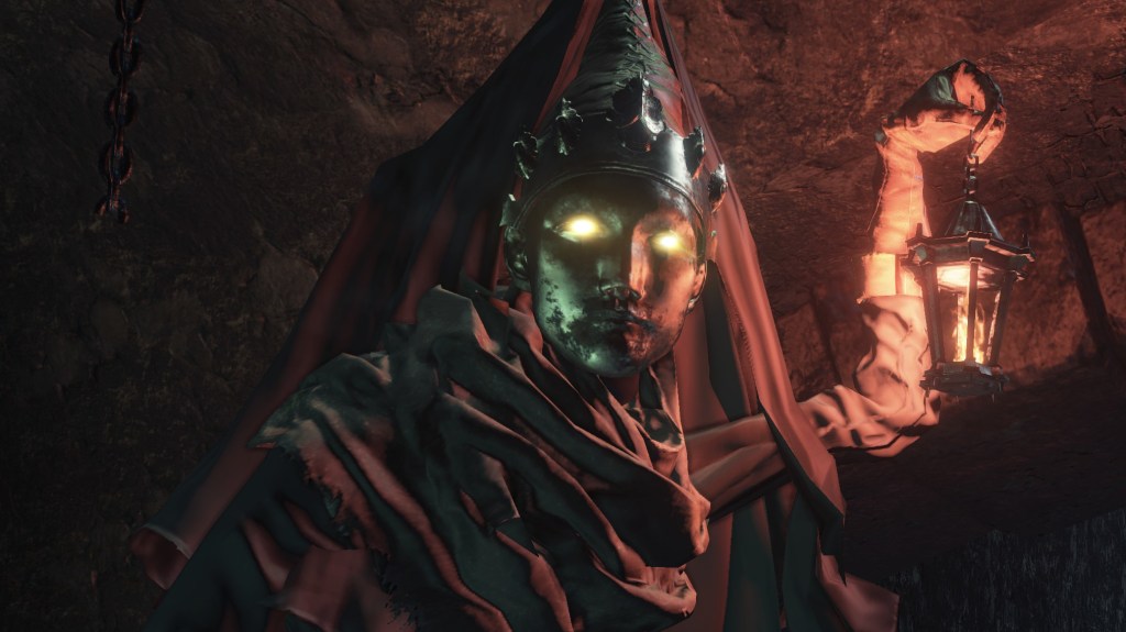 Giggling as always, the women come at others wielding a searing hot iron to brand them like cattle, with the added bonus of preventing them from healing with Estus — liquid bonfire heat — until the damaging heat dissipates from the body. They can also use their lantern light to inflict a curse that weakens others’ life force while in line of sight. Typically, this is preceded by the jailer in question spitting out some peculiar substance at their feet, which immediately turns to gas. Such a curious ritual is accompanied by their masked eyes and magic lanterns turning red. Considering that the handmaids never demonstrate such abilities, these jailers might have inherited them from Sulyvahn, perhaps even as the result of one final experiment in exchange for their freedom. Either way, such cursed power makes getting caught during escape attempts all the more deleterious. Beyond dissuading, it may have left countless innocents frozen in terror to ever catch a jailer’s eye.