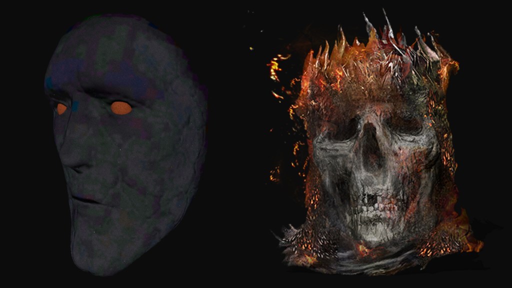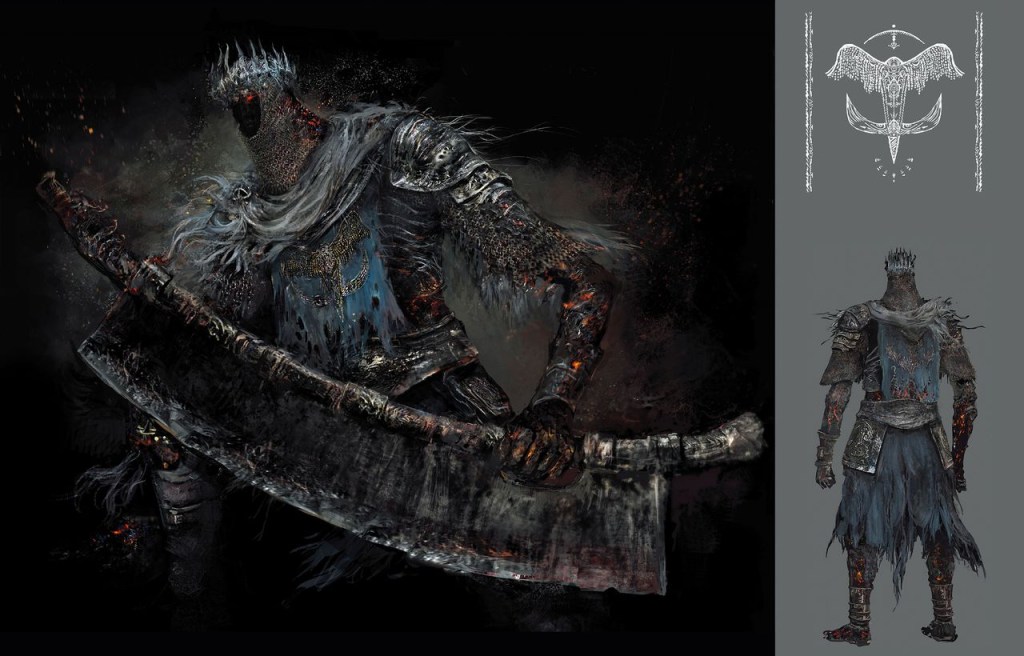 Some might argue that the Profaned Flame was acting up and actually burned Yhorm, noting his scorched skin that lights up at the cracks in second phase of the boss fight. However, this is probably just a remnant of an earlier concept. Originally, it wasn’t Yhorm encountered in the ruined capital, but Wolnir, as seen in the gameplay reveal trailer — which likely influenced the eventual decision for both bosses to be related. Yhorm would instead take Iudex Gundyr’s spot as the tutorial boss, internally named “Berserker Harrek” (狂戦士ハレック) in humorous reference to Gunda the Guilty’s best friend in the Fighting Fantasy series. His second phase is thus perfect for showcasing “heat up”, which was advertised as a unique boss mechanic during the game’s early promotion. Put simply, Yhorm was designed to emphasize the concept for new players. “Harrek” was clearly a Lord of Cinder, plus the intended owner of the oversized casket in Gundyr’s boss room as the game’s announcement trailer shows; concept art even portrays it similarly on fire. This leaves every reason for Yhorm to be similarly charred by the First Flame, if relevant at all.