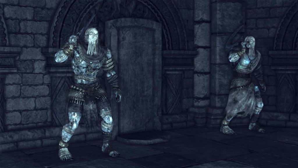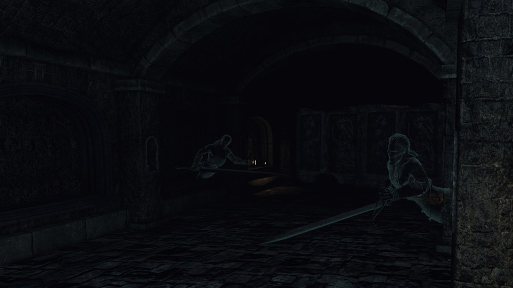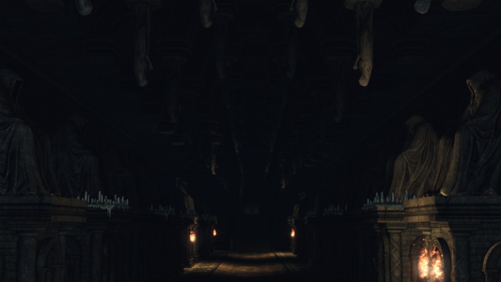 Indeed, the insolent highlight flexibility to the afterlife. Traditionally, the living dead have consisted of tangible remains reanimated by the soul’s grudge or necromancy. Not so for many of the crypt guardians. The “imperious” knights, for all their heft, look devoid of substance underneath the tatters of the armor. Leydia pyromancers likewise manifest from their tombstones at the Undead’s bell toll, appearing as disembodied robes wielding armaments. Contrast to wall ghosts, swordsmen who phase translucent upper bodies through barriers to attack unsuspecting passers-by. None of these enemies require curses to be harmed, unlike the ghosts of New Londo from DS1. These thus seem to not be flesh bodies cursed with incorporeality at the soul’s will, but actual souls taking shape similar to other-world phantoms — or at least letting their old equipment shape them. Only Leydia witches persist as blue-skinned cadavers akin to Fenito, overall expanding our conception of living dead. But to ghost or zombie, many have fallen victim to the dangerous forces within the mausoleum regardless.