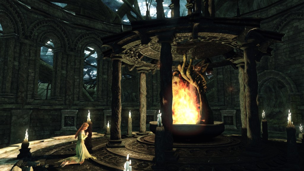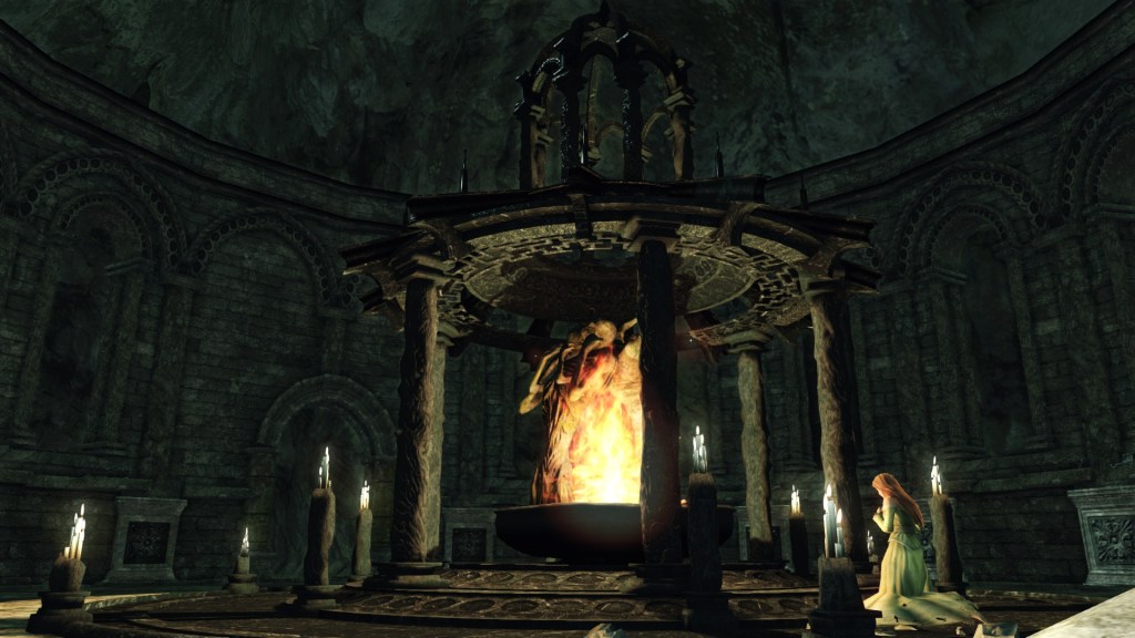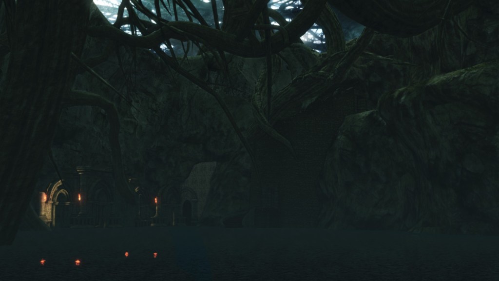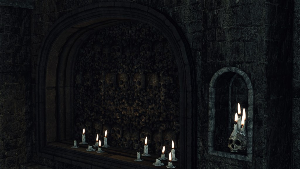 Once we go through the decorated doors evocative of Anor Londo in the Shrine of Amana, we take a large lift down to the Crypt, identical to those seen in DS1’s New Londo. This is the only time this style of lift is employed, making it unlikely to be a case of reusing assets. In other words, the entry point was likely built as a direct connection to New Londo originally, before the Crypt ended up in the New World. Nito was constructing an enormous graveyard in conjunction with the Undead city as part of his larger collaboration with Gwyn. Anor Londo would collect all the cursed in one place, and the Kingdom of Graves would receive all those ultimately put down as Hollows. It was an efficient system, and complements the Gravelord’s concurrent contributions to Anor Londo’s cause. It also solves a hanging thread from DS1. We saw graveyards for the gods, their giant slaves, their human servants, and the Undead Burg, but not New Londo. The simple explanation was that any burial ground was submerged with the city, and the Undead Crypt reaffirms that insinuation.