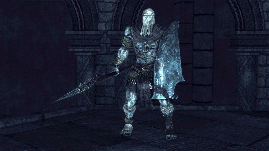 Another unwanted party were an order of knights famed for their strength once upon a time, though their country of origin goes unmentioned. These elite warriors don’t employ a traditional arsenal, instead relying solely on a pair of greatshields to pummel their foes with while maintaining an ironclad defense. The shields depict Orma and Reeve, the twin followers of some higher power who judge men’s souls in the afterlife — each implicitly arguing for their good or ill deeds in a debate. The symbolism of seeing the twins’ image approach moments before death is humorous, but the characters and the circumstances behind them don’t fit into the series’ established cosmology. In short, Orma and Reeve are pure fiction from the knights’ pagan religion. That being the case, their reason for assaulting the Undead Crypt is obvious: they identified it as their faith’s underworld and hope to meet, if not liberate, the twin entities who had “helped” them in so many battles. For the first time, their conquest failed.