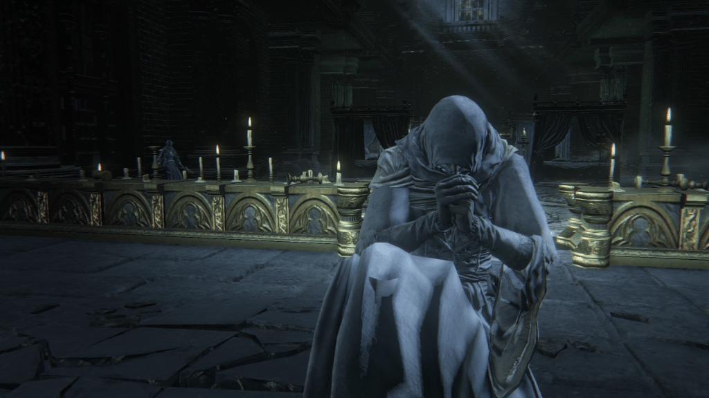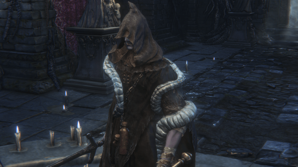 To that end, Yharnam’s new hunter returned to fulfill his divine calling. As if the cavalry had arrived, the “knight” would swoop in and save many an apprentice to Gehrman struggling against former sibling disciples. And now with public proof of his new hunting style’s effectiveness, Ludwig reached out to Yharnam’s citizens for recruits, which probably wasn’t too hard. The former scholar was styling himself as something of a prophet, a man who could credibly claim to have received power and guidance from the gods this cloistered city still worshiped. That religious framing was sure to inspire even the instinctively suspicious Yharnamites to join in a foreigner’s holy crusade against the beasts. Since the “Healing Church” hadn’t yet been established, these new hunters were being outfitted in garb not too different from other old workshop attire; its origin there explains why we can purchase it from the bath messengers in the Hunter’s Dream from the moment we arrive.