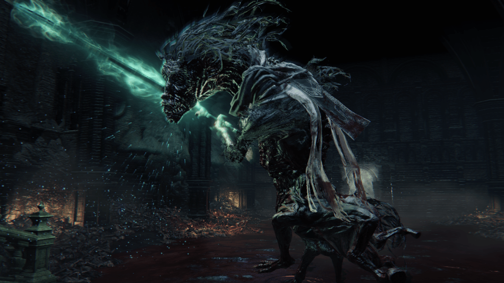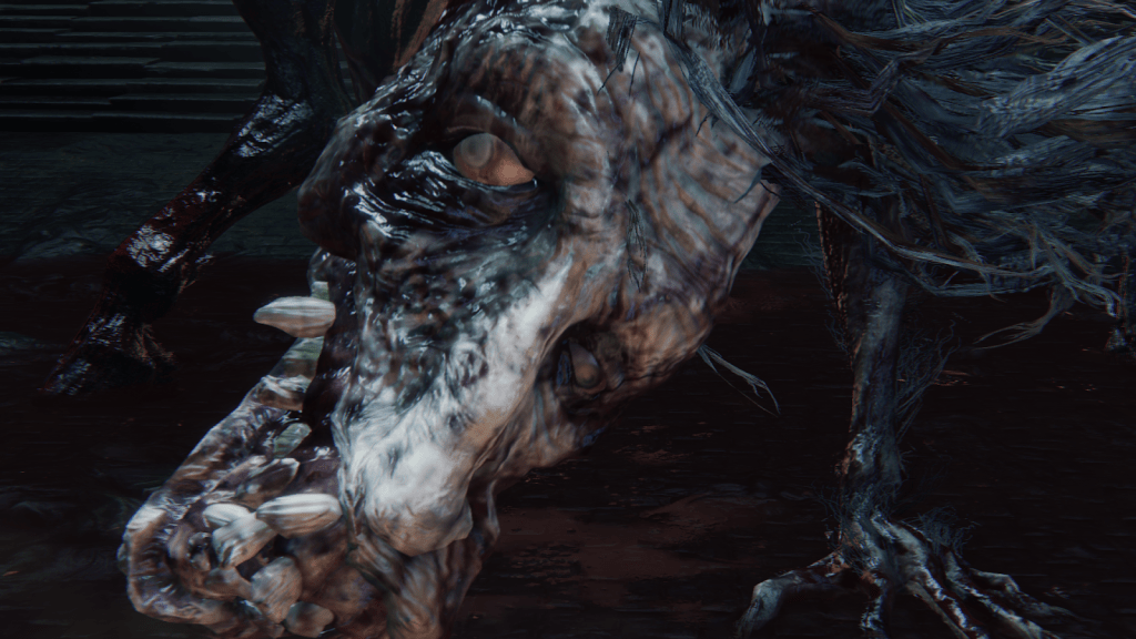After dying a lunatic, Ludwig’s soul was inescapably caught in the Hunter’s Nightmare. For his karmic punishment, Kos cursed the Holy Blade to become an unsightly and warped monstrosity worse than any he had ever hunted, the most horrifying cleric beast of them all. His most human element, the horse head, screeches next to a headless maw of teeth, its throat lined with the eyes Ludwig and his ilk so desperately hoped to gain from taking in blood — the geyser of saliva the gullet spews even deals arcane damage. These dual heads convey their owner’s deceptive nature, the “majesty” of a beast symbolic of a knight covering for the mindless, self-serving, insatiable pursuit of a scholar. And yet, it is the horse head whose eyes are clouded. Indeed, the monster appears compelled to relentlessly hunt hunters, doomed to be beasts of their own as they are, from the river of blood’s source. Kos has made the “knight” everything that he feared he was within and would be without, drunk on the blood of the hunt he so relished in life.