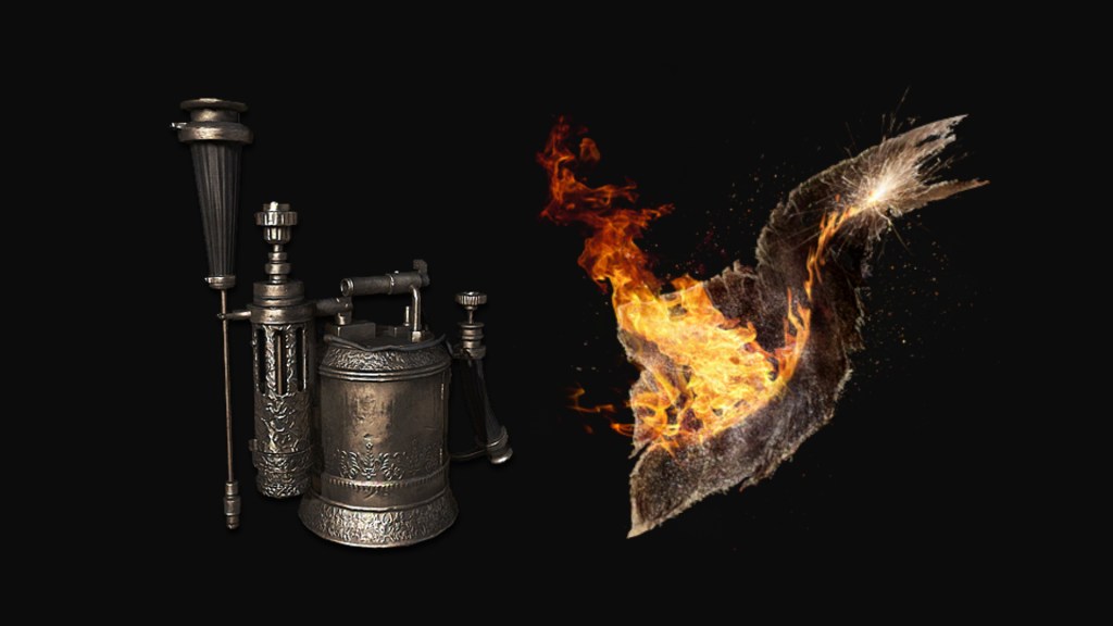 Ludwig’s radiant sword hunters also appear to have pioneered the techniques now all too common to beast hunting. Their badge allows purchase of both fire paper and the Flamesprayer, a weapon perhaps most appropriate to call a “firearm”. While nowhere near as efficient with ammo as a more conventional gun, the “flamethrower” (火炎放射器) nonetheless accomplishes its objective of bathing flesh and fur in a sea of flame, hence seeing use with some church hunters. Meanwhile, fire paper is a church workshop invention designed to simply and easily set a weapon alight so as to burn prey with each strike. Both options indicate that the Holy Blades made liberal use of fire. Indeed, flame has been equated with purification, like an exorcism. And even without that holy connotation, it is the perfect fit for such radiant hunters — only natural that getting too close to starlight sets you ablaze. Somewhat related is the bone marrow ash from Hemwick, giving Holy Blades a means to further improve upon their firearms. Whatever increased their chances slaying true monsters, they took.