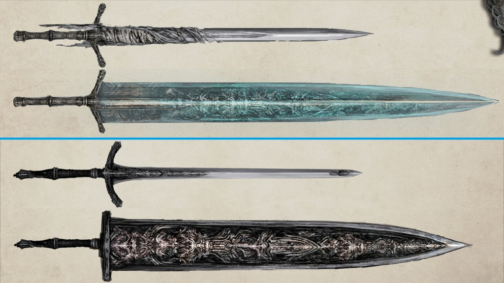 Despite all the proclamations of holiness, few had actually seen Ludwig’s alias. While his form in the Hunter’s Nightmare suggests that the sword itself was always brought with, the man kept the giant cosmic blade hidden and beneath bandages, hoarding its guidance for himself. Perhaps the hunter feared others stealing his god’s attention and robbing him of his teacher. As far as he knew, only one could earn the stars’ favor, so limiting others’ contact would safeguard his illumination. After the initial public showcase, those few who did confirm its existence firsthand most likely comprised of the highest-ranking blood ministers, such as Laurence, and the workshop engineers directly involved in reimagining it as a trick weapon. None of them would necessarily learn the sword’s true nature before it was again “sheathed”.