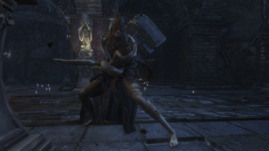 Above ground, Ludwig’s hunters fared no better. The Radiant Sword Hunter Badge is stored in a chest on the church workshop’s top level, away from where all the hunter weapons are produced and hung; the implication, the emblem is no longer being distributed. Its description likewise implies that the Holy Blades are from another time, no one presently thinking of hunters as heroes. Without their leader, the group seems to have fallen apart, most probably killed by beasts or as beasts. Wallar’s rifle points to him being a Holy Blade, but he apparently followed Ludwig’s footsteps and became another madman in the labyrinth, wielding the arm of a small Amygdala. Considering that the hunter can only be encountered as a summon for the lower of half of the ruins, he may have even come down there in search of Ludwig, not realizing that his leader chose to explore the Hintertombs further up. There is also a Yahar’gul hunter with the same rifle in hand, but the Rifle Spear in his other suggests that this is simply a partiality for long guns. The church has no more holy swords.