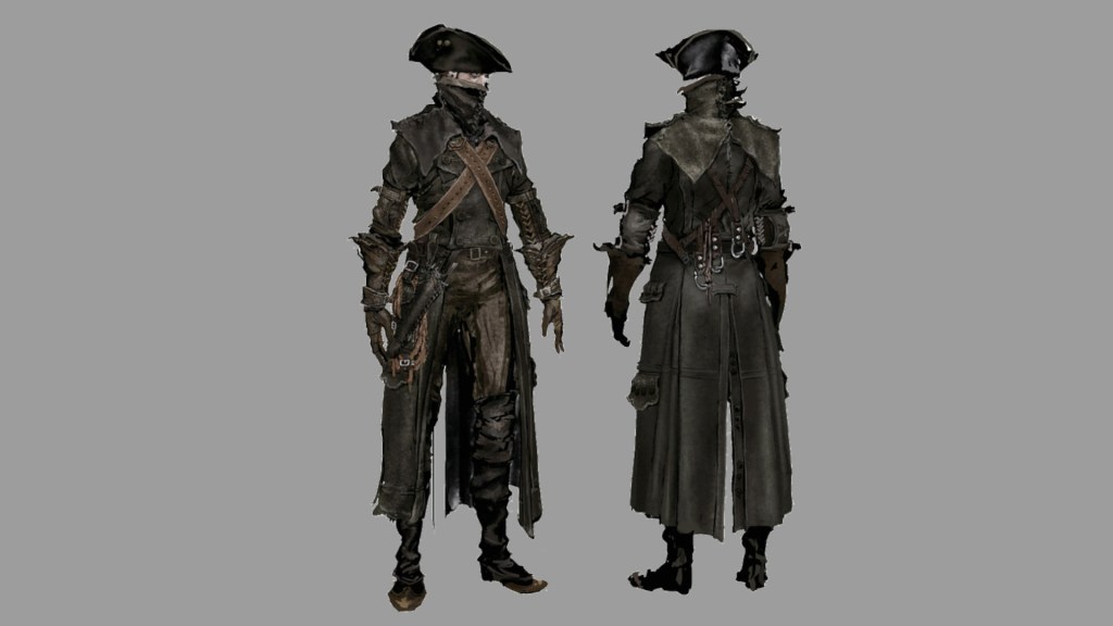 We can spy remnants of a heavy white cloak on Ludwig, a sign that Holy Blades were dressing for the part later on — his song reaffirms their use of a “white robe”, again presumably to symbolize the stars’ radiance. This thick mantle motif was taken from Byrgenwerth’s student uniform, so it might have even been Ludwig’s choice of attire since first founding the group, combining his academic roots with his new calling as a man of God. Naturally, the design was carried over to other church garb. Being all former Byrgenwerth students themselves initially, the blood minister uniform became a similar white cloak and robes, signifying their high rank comparable to Holy Blades yet distinct lack of dedication to hunting. For them, cutting up beasts was just part of their larger work researching blood ministration, not the main focus. And since that was the church’s underlying purpose, new cleric hunters were made to work under them, dressed in black to denote their subordinate role by contrast. However, this seems to be where the junior clerics were afforded flexibility.