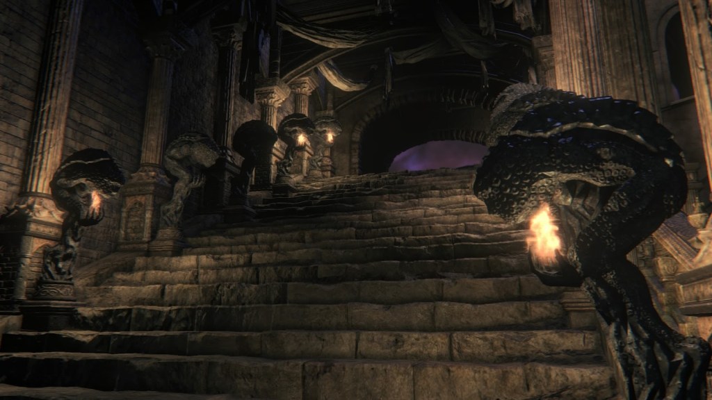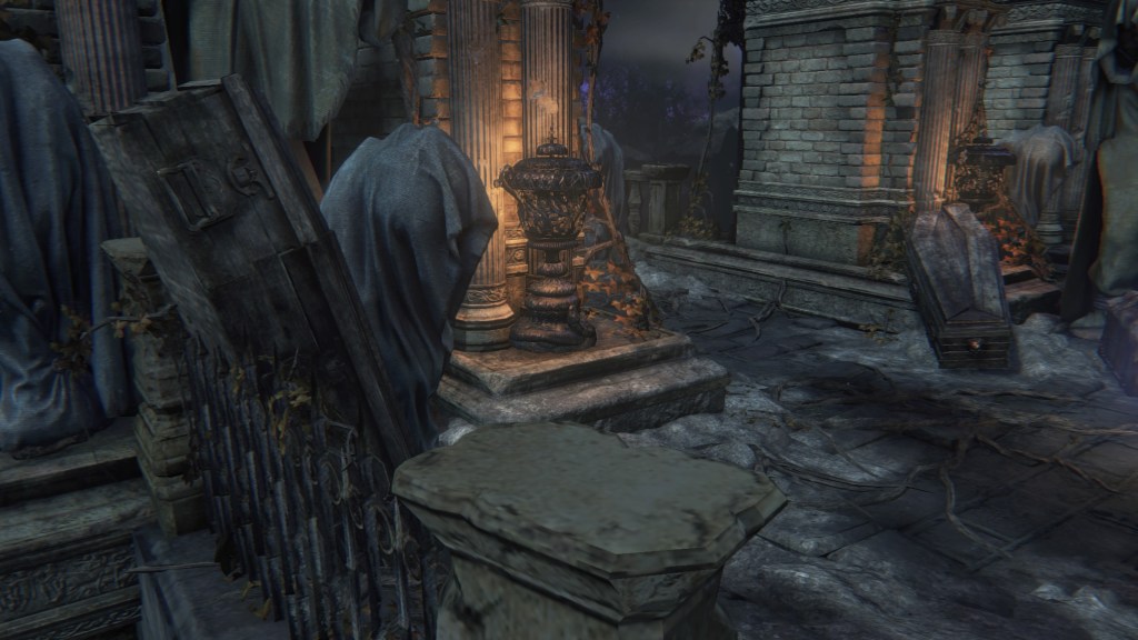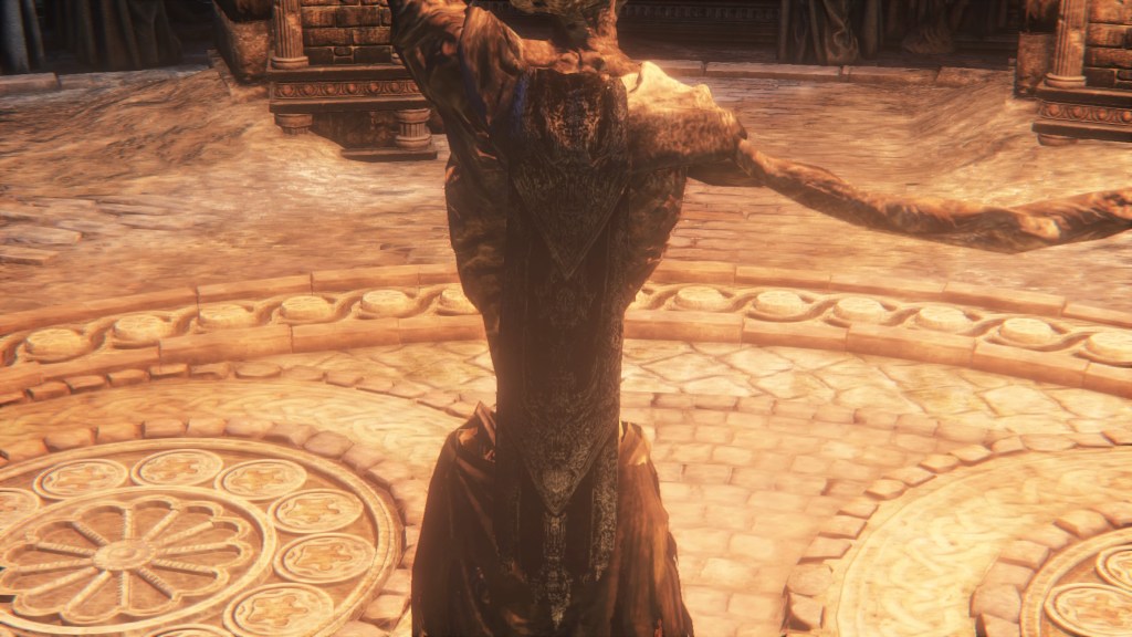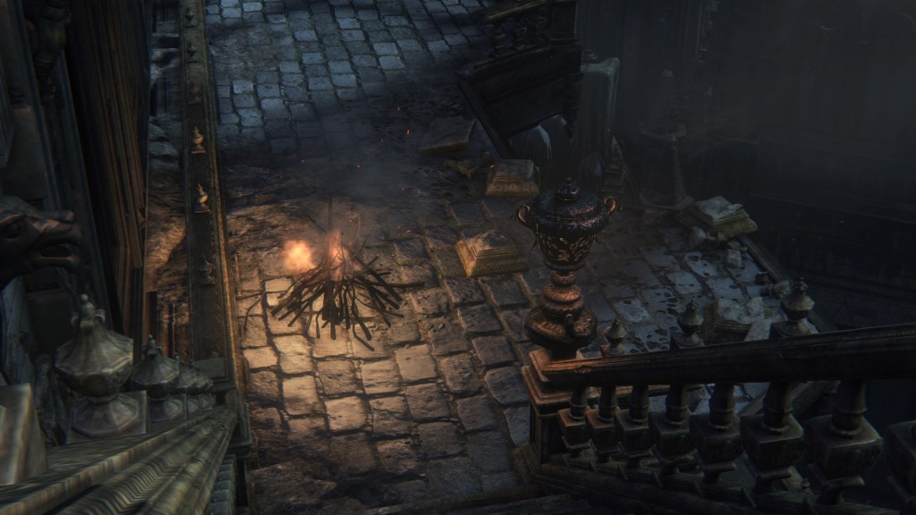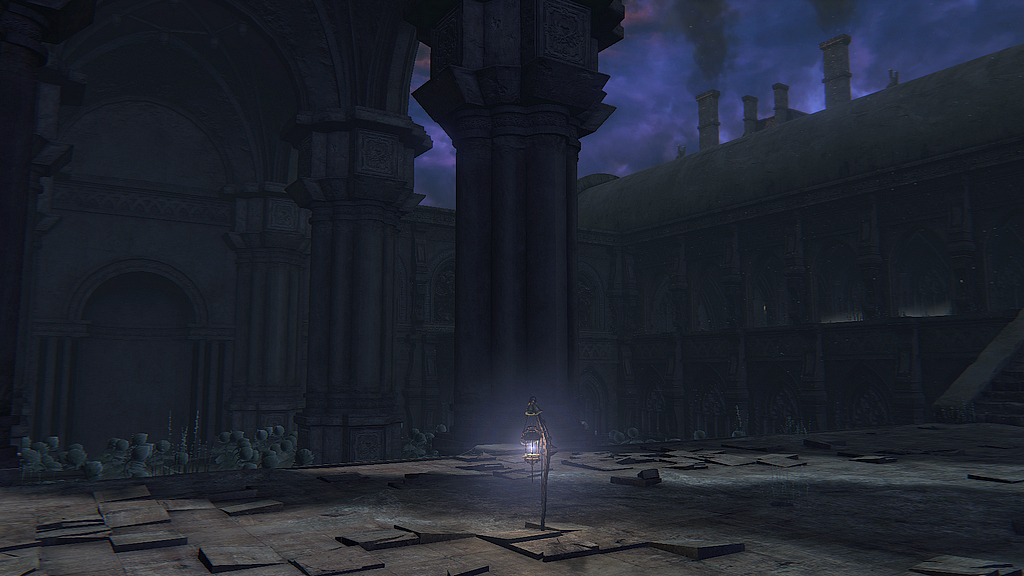 Some who went mad seem to have survived long enough to exit the side entrance and set up camp. But, the broken stone railing around the campfire suggests a serious scuffle, likely with the scythe-wielding church servant now guarding the side entrance — we do see that the Pthumerians have begun their nighttime patrols upon our arrival. Based on the many carrion crows surrounding a lone madman’s corpse below the railing, the campers were killed from being knocked down and all but one devoured by the scavengers. Another stands on the second floor terrace performing the Make Contact gesture toward the Astral Clocktower, his tattered Choir robes and mummified body indicating imperfect success — curiously, the corpse gives us the prompt to “talk” to learn the gesture, though this might simply be an oversight by the developers. Two other corpses outside the main entrance face the Grand Cathedral prostrated in prayer, and they aren’t alone.
