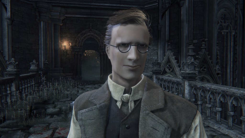 As the Choir’s research progressed, so too did their cold war with the School of Mensis. Edgar is a spy for the Choir, armed with the same Ludwig’s Holy Sword and Rosmarinus setup as Gremia but wearing the Mensis uniform to blend in as a member of the rival faction; like his other named cohorts, he even utilizes Augur of Ebrietas. His true loyalties established, the spook presumably followed Micolash and his ilk inside the then newly-created Nightmare of Mensis where we now cross paths. If the man had infiltrated the group at their home base in Yahar’gul before the red moon ritual, then it is only natural for him to take part in the ritual and continue monitoring Mensis from within the Nightmare. However, it appears that neither Edgar nor the Choir expected this development.