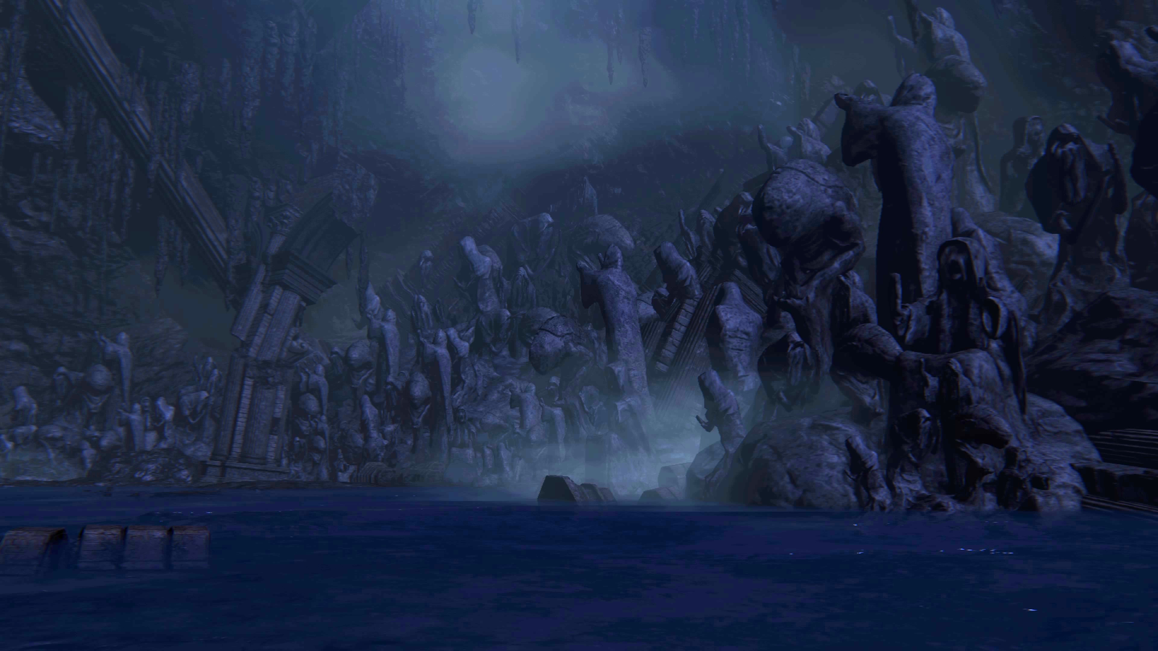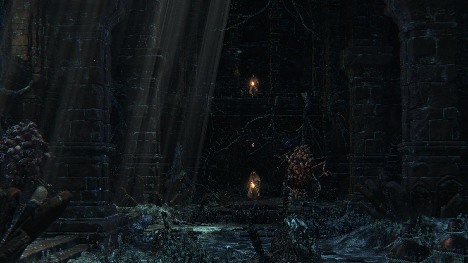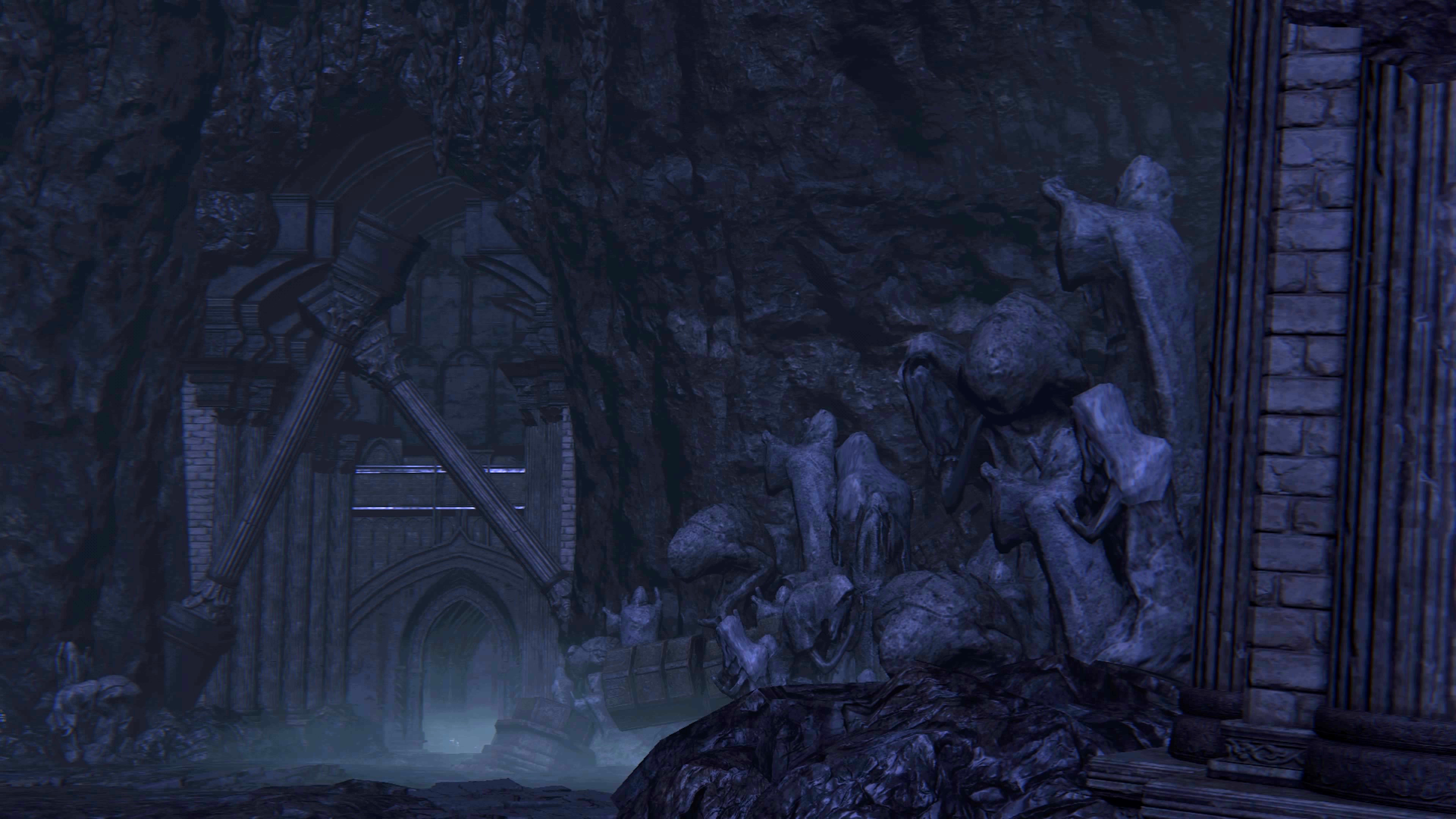The Altar of Despair resides in a large cavern underground based on the light shining in from a hole above, presumably the same source for the water flooding the place. Although difficult to spot due to the rubble, there is an actual altar at the far back, far simpler but not too dissimilar from the one in the Grand Cathedral — it even has a leafless tree as backdrop, though comparably younger. This altar is likewise preceded by church flooring, columns, and statues adding an air of gravitas to the location, but they have all fallen into ruin from neglect. And yet, this minimally-renovated cave is where we first find Ebrietas, with the Choir’s chalice in her possession. By all indications, the Great One came to acquire the cup in the cavern, which likewise implies that it somehow connects to the ruins — much like the similar subterranean cave in the Forbidden Woods. In fact, that was in all likelihood by design. A chalice’s value lies in blood rituals, so this must have been the Isz Chalice’s purpose until Ebrietas was lured up to the altar.