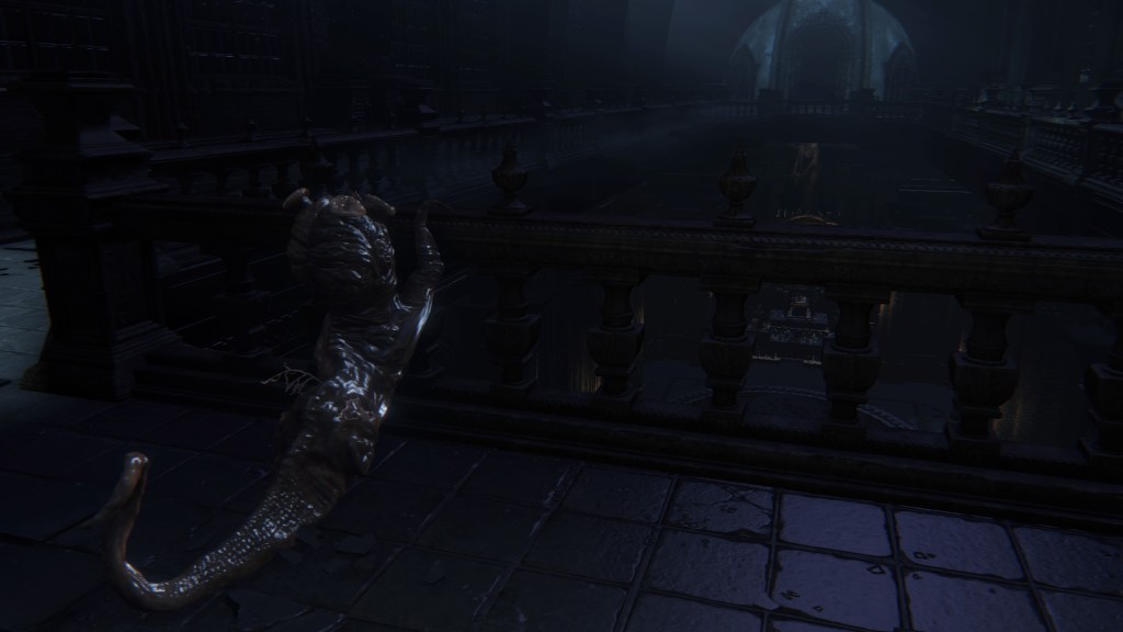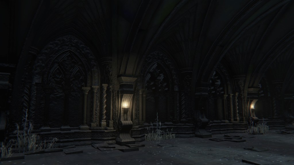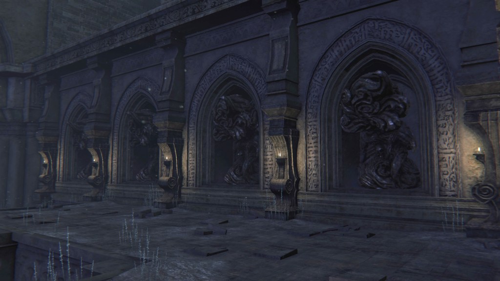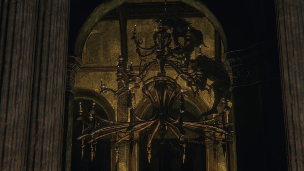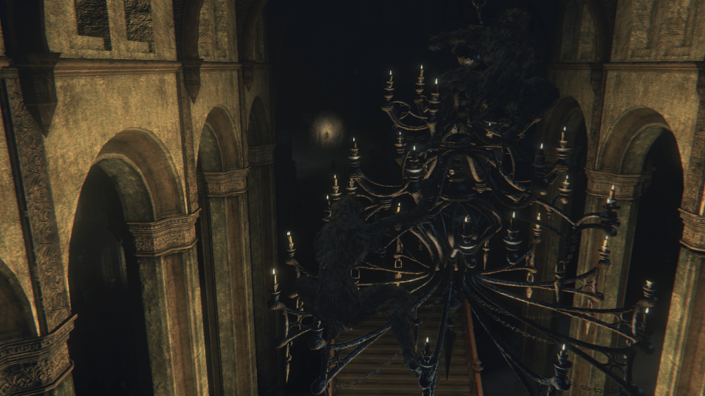 Replacing the lift to the Research Hall, the Grand Cathedral has built another to the subterranean altar as part of the interior balcony. While we can only enter said balcony through a window in-game, it must be somehow accessible to any member of the upper stratum, allowing them to literally watch over the cathedral’s daily operations. In that case, why build effectively a second church beneath the main one, and so deep underground? Moreover, why only give this holy place for the clergy elite the minimal furnishings, not to mention no upkeep? The answer is because the church and its altar had but one purpose: bring Ebrietas out of the labyrinth. The Healing Church accomplished that objective, so its disrepair over time has gone ignored. It now only need house the Great One, a specimen the Choir would want access to. The ritual altar was the stage with the Isz Chalice as the bait, and Ebrietas took it.