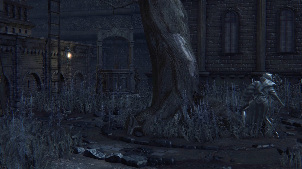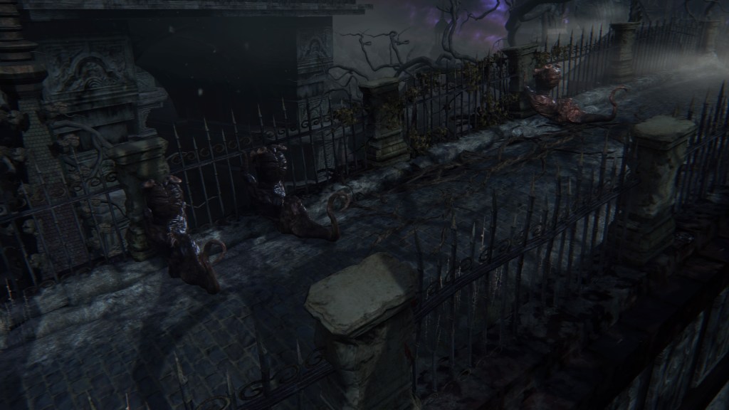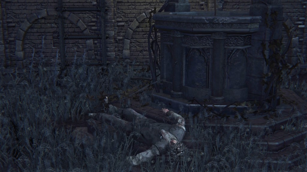 With all this in mind, it is easy to imagine a random patient stumbling upon the bad doctor while looking for staff, making a big enough fuss at the horrors for Iosefka to overhear. The Choir woman would then have to prioritize the bigger threat and confront the good doctor. Their safety compromised, the patients would likely make their escape, perhaps at Iosefka’s direction. But if the Church’s brain made sure to do battle around the doors Iosefka guarded, their normal route would be blocked off. In that case, the patients would have no choice but to try taking the back route. Unfortunately for them, the birds lay in wait and swarmed the group. Two managed to make it through and head down the ladder, only to be impeded again by a locked cemetery gate courtesy of the Choir. To double their misfortune, one then succumbed to the blood and transformed into a brainsucker, which drove the onlooker mad. Once that kin killed the madman, the infiltrator lost all of her research subjects.