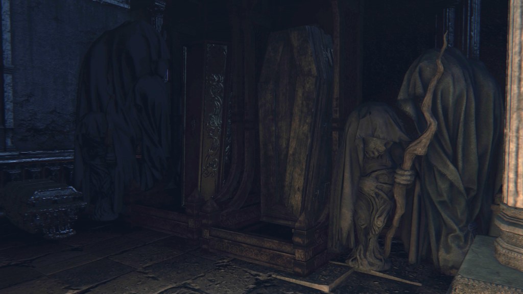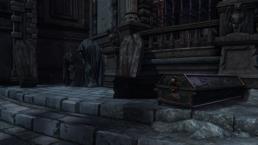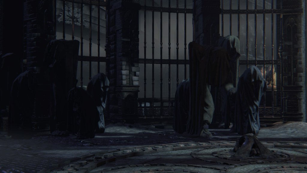 When it comes to factions in Bloodborne, the Choir might be considered the most underutilized. Compared to the School of Mensis, they certainly don’t play as up front a role in the game’s plot. That said, I would argue that their presence is felt even in their absence. Indeed, anonymity is part of the point. It wouldn’t do for the secret puppet masters to make a spectacle of themselves. Their work is something that needs the door cracked open. But I think the bigger factor is that we are seeing the Healing Church in decline; the puppet masters have no strings. The Choir, and its physical absence during all this chaos, is a symptom of a deeper problem, proof of the rot in its very foundation.
