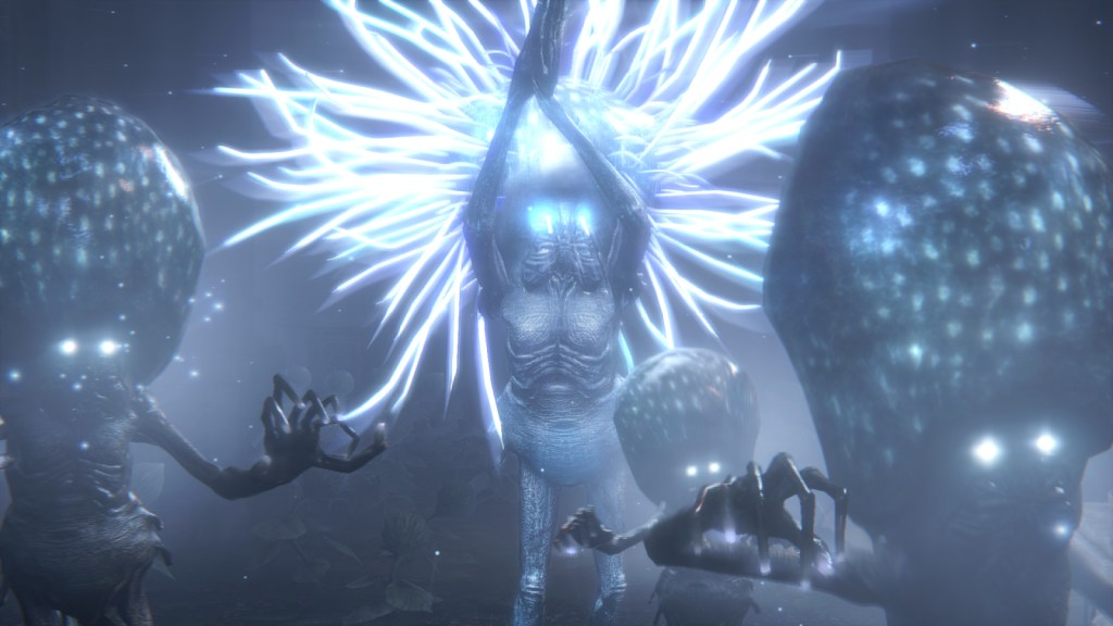 As mentioned earlier, the Upper Cathedral Ward is home to a messenger from the stars among all the bloatheads rising from the lumenflower garden. The boss initially looks no different from the other kin, only acting evasive rather than hostile. However, damaging it eventually causes the creature to curl up and gather arcane energy, starry lights drawing together to momentarily form a cosmic sky before exploding as the creature grows to gargantuan size. At this juncture, the boss begins attacking with its arms and legs, and its head eventually springs forth numerous tendrils as the battle progresses. We see the other Choir creations very rarely manifest the same protrusions enabling them to shoot arcane energy, but this giant can additionally pray to empower its kind with more HP. And unlike the Living Failures, the game’s trophies describe the Celestial Emissary not as a failed-to-be Great One but the genuine article. The stars have clearly answered the Choir’s call, elevating a guide with whom their transcendent evolution might see some measure of success.