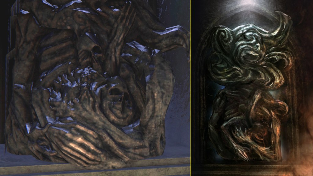 To be fair, this situation isn’t that far removed from their target. The Choir, like Ebrietas, look up for signs from the stars. As before with their Byrgenwerth mentors, the hope is that the Great Ones above will implant the kin buried in the garden with phantasms, the purpose of which is depicted in the new statues encircling the perimeter. Each portrays human skulls sunken into the burgeoning womb area of a grotesque entity resembling Flora, as if to signify man becoming one with the Great Ones of Isz and being reborn as their offspring — children of the stars, if you would. In short, the Choir have primed themselves for their next childhood and pray that the gods will guide their thinking the rest of the way. Willem might weep at the pathetic state of his ideological grandchildren, but their piety may have been rewarded.