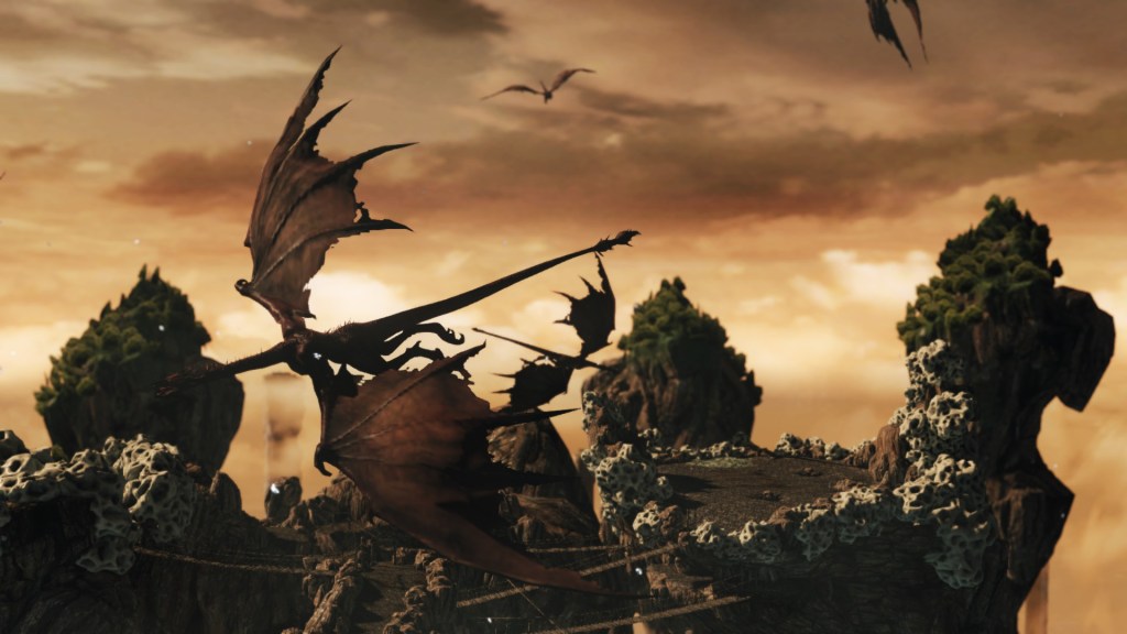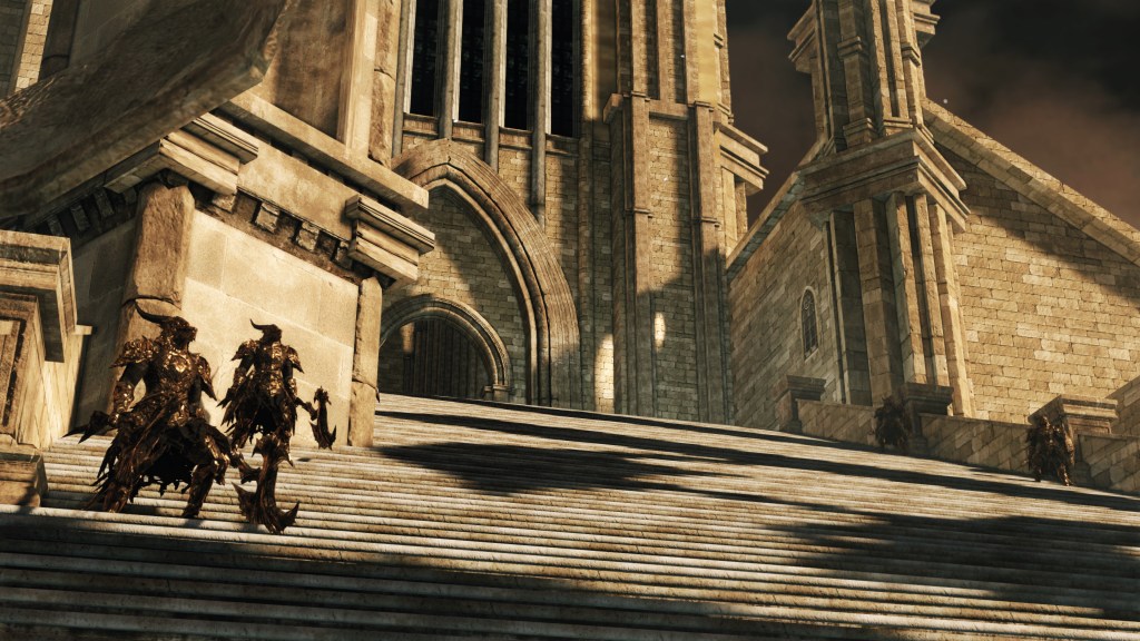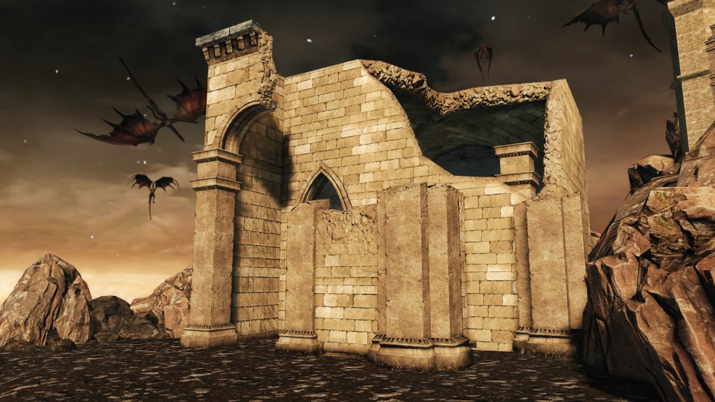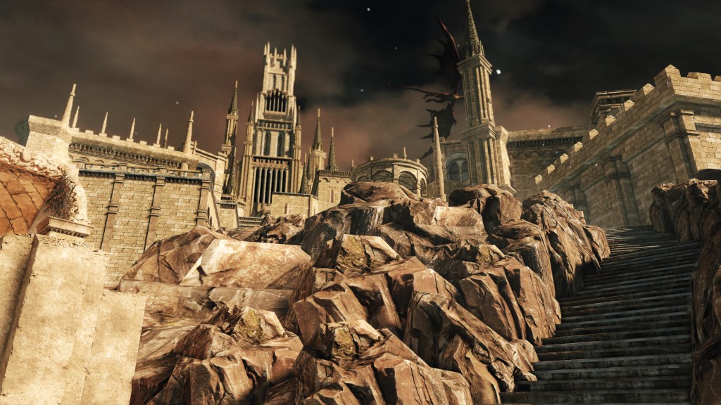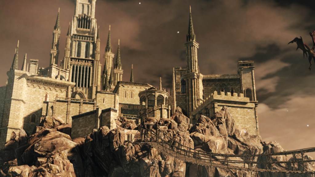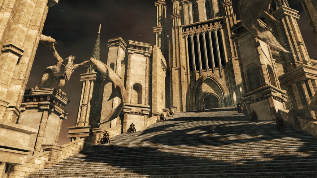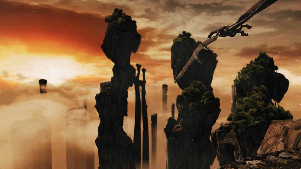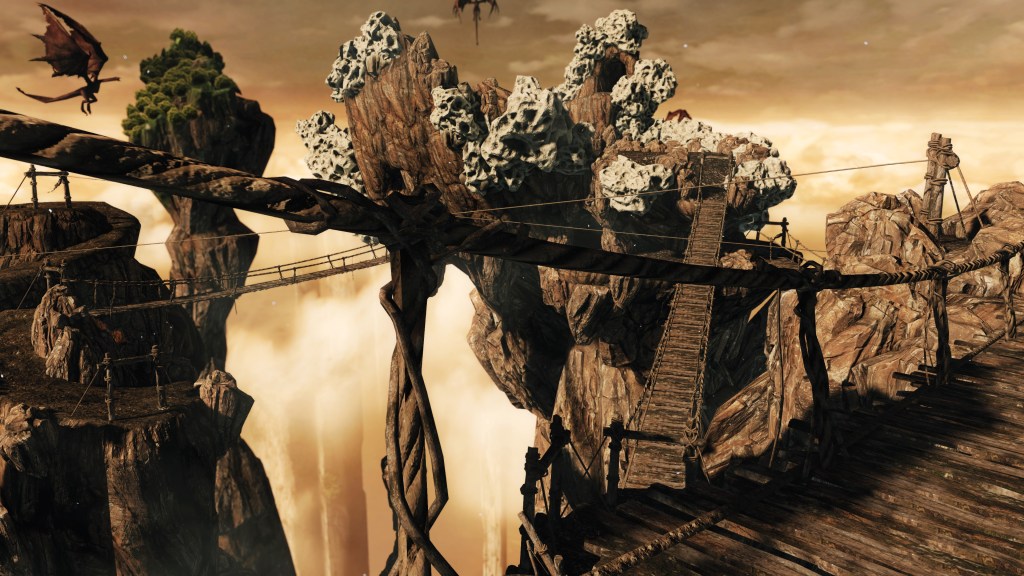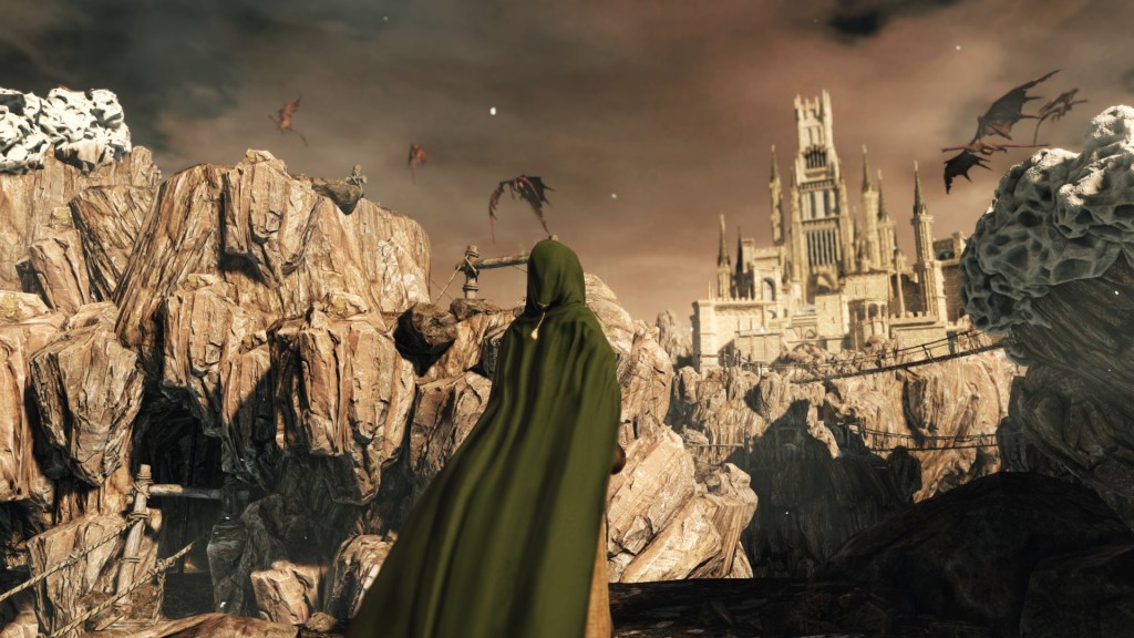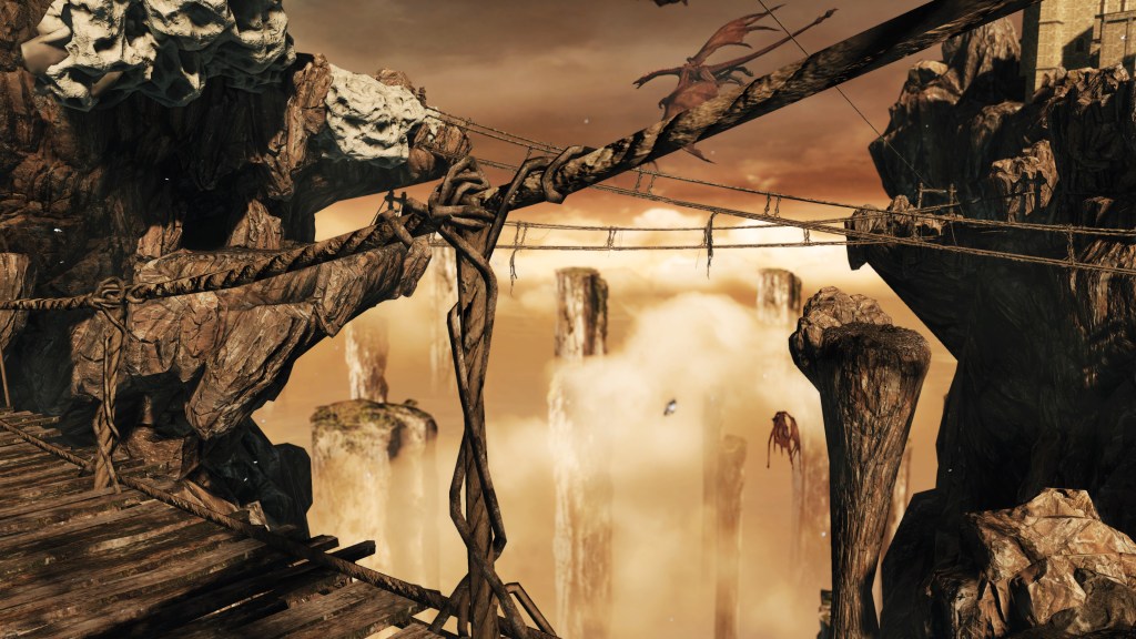 I have previously mentioned my reservations about Dark Souls II‘s main plot, and the Dragon Shrine is very much an extension of that. The area itself is somewhat iconic, essentially an island in the sky with a swarm of fearsome lizards that could swoop down and nab you at any given moment. It certainly leaves an imposing image unlike anything seen in the original Dark Souls, (DS1) and the big fix has even made the tour through the area an experience unlike anything in the whole series. If only the narrative behind it all matched the ambience.