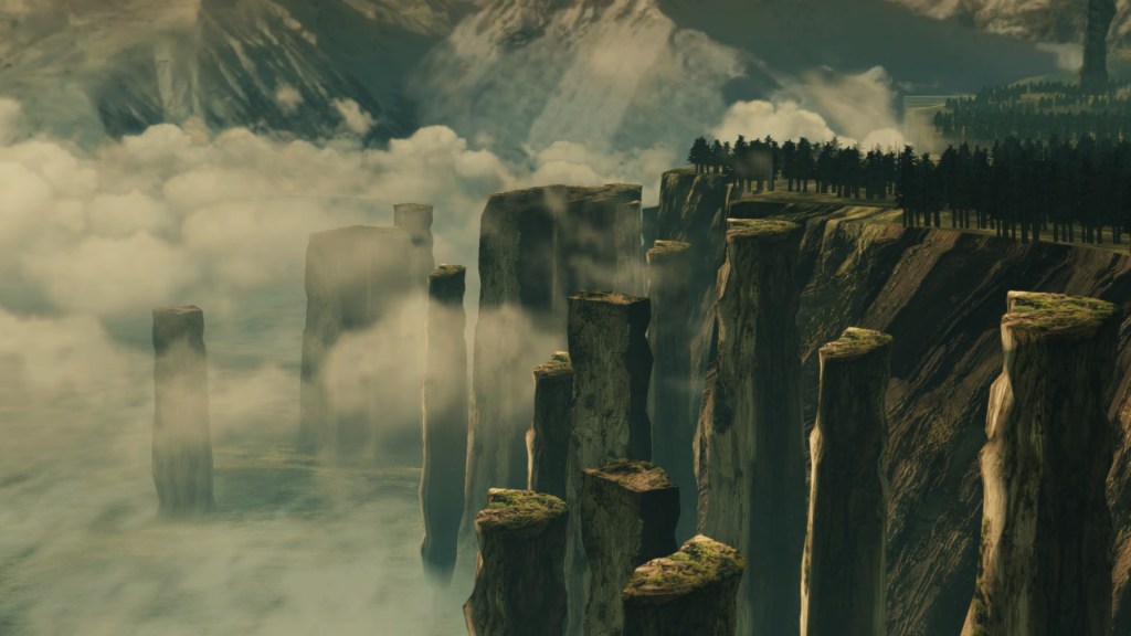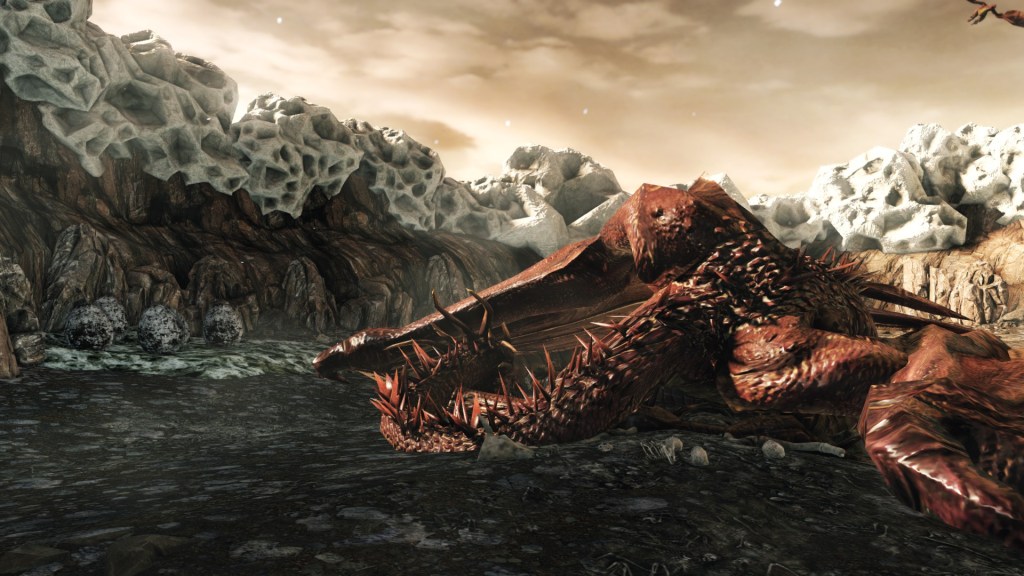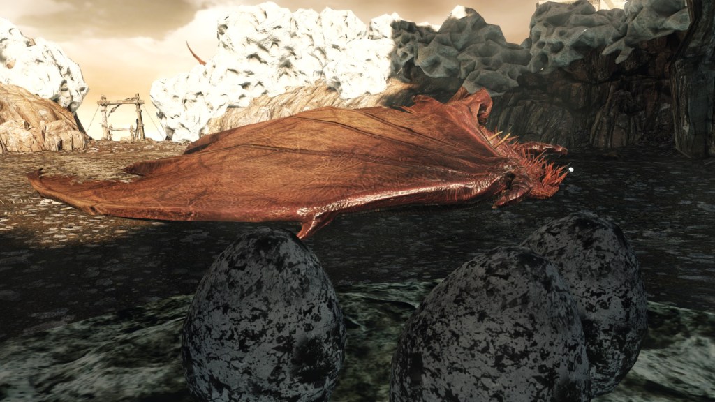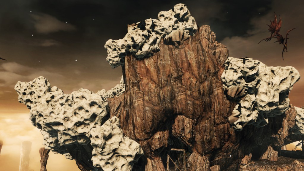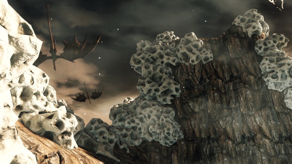 Before there was a shrine, there was already the Dragon Aerie. This wyvern nest is seated atop rock formations towering above the clouds which are themselves nested between two mountain ranges in eastern Drangleic. We can already see the beginnings of these formations after first leaving Shaded Woods for Aldia’s Keep, so they are most likely the product of longtime erosion, clashing winds from each mountain range weathering the ridges of old; perhaps exacerbated by difference in temperatures. Regardless of the exacts, the geology made for an ideal perch for flying dragons, the fossilized bones littered across the historic land above ground suggesting that they have been native to Drangleic since well before the Great Shift. Not only has that allowed for a healthy population of dragons hovering about the aerie, with plenty more on the way, but this also gave the breed a chance to develop their habitat.