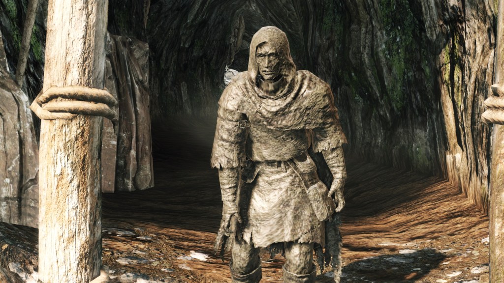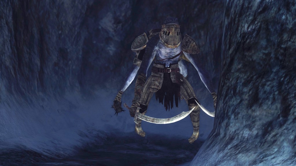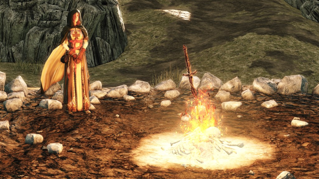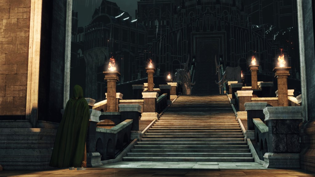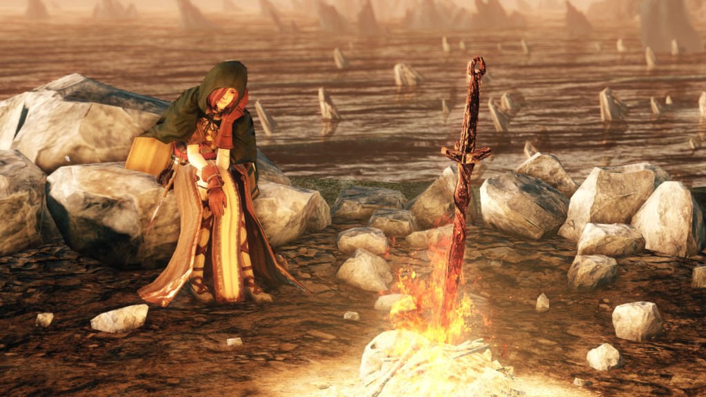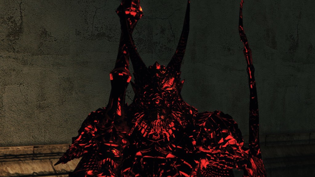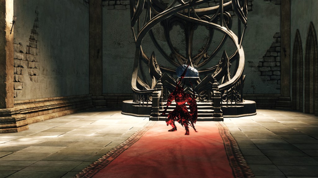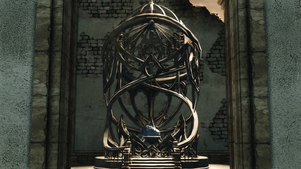 For her part, Shanalotte doesn’t actually seem to be invested in the outcome, assuming that her narration at the end is to be believed. Whether we choose Cinder or Dark, she still did her job to make us a Lord, so the fact that perpetuating the Age of Fire will cause this situation to repeat makes no difference to her. Even before then, she readily acknowledges the possibility that we might Hollow and end our journey prematurely. She gifts us an Estus Flask and offers to incorporate any Estus-soaked bottle shards we find into it, but she is hardly a cheerleader. Perhaps the Fire Keeper is simply weary from all the people she has aided only to one day never return. But even as we use her services to strengthen our soul, she questions the wisdom given its joint benefit for our curse. That isn’t the commentary of someone fervently focused on us becoming fuel for the First Flame.