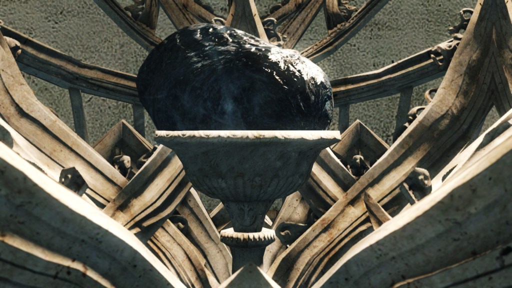 Of course, in mentioning other members of the Dragon Remnants, there is the direct implication that others made use of the egg. That seems to be the purpose behind the Dragon Shrine. That grandiose building was constructed on several particularly large stone spires behind the wyvern nests, Aldia’s everlasting creation left to laze on an open platform at its innermost depths. The stone beast is clearly treated like a god, a Drangleic priestess, a dragon charm, and a Shulvan relief further indicating the Archdrake Sect’s involvement in construction; we do find a dragon charm in the aerie. Through the door beneath the relief, we ascend a spiral staircase to an august chamber. At the end of the red carpet, we find that the egg is itself enshrined in an intricate receptacle. But the “shrine” is more literally a “ritual place”, (祭祀場) both it plus the Dragon Aerie internally dubbed the “Dragon Ceremonial Site”. (龍の祠祭場) This puts the emphasis more on the rites being performed than the things being enshrined, and Aldia’s followers are no stranger to performing magic rituals.