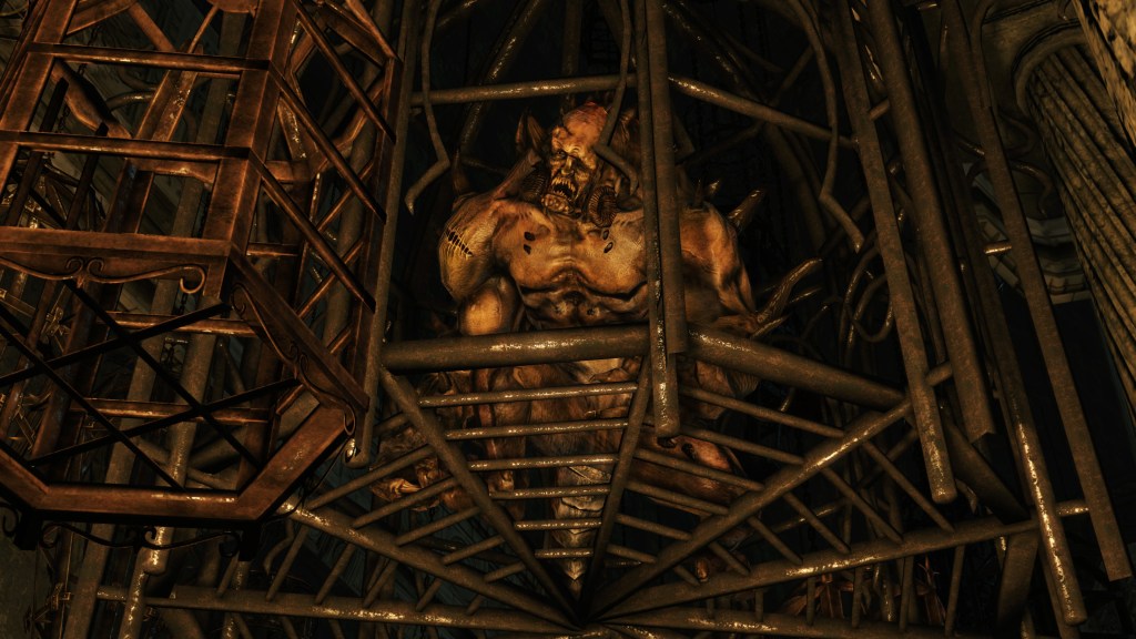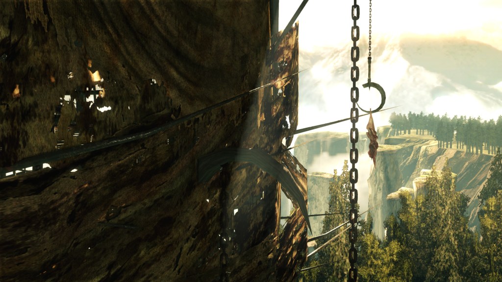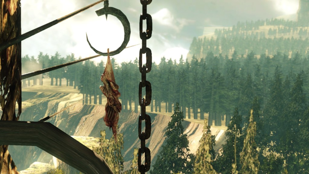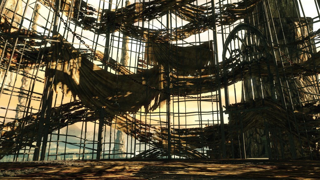 Little changed as pieces of Lordran arrived at the New World. The lootable Dragon Tooth suggests that a Havel warrior came to hunt, but if so, the culling failed. Looking at Eleum Loyce, their immediate hunting grounds became more competitive, but the skies insulated them from the human migrations. It is only when Vendrick established himself as king that things began to drastically change for the aerie. Aldia building his mansion near Drangleic’s future wyvern steeds is no accident. A giant cage is set up behind the secret ceremony building. Beyond it we can take a lift up one stone spire to the aerie. The masses of meat hanging from the Aldian acolytes’ implements affixed to the cage, however, indicates that the goal is to lure the flying lizards down to them, hence the open top. Spikes restrict the dragon’s movements once inside and hinders any outside assistance — though the boss nestled within latches onto the sides anyway, all the bloody cloth affirms the disincentive. Add in the dragon statue operated to enter the ceremony building, and it is clear that the nest was the primary reason for construction.
