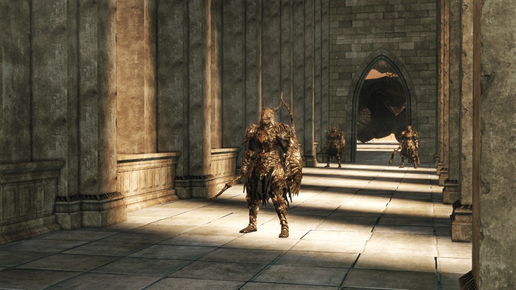However, the description for the drakekeeper armor notes that something darker than its jet-black metal hides within these golems, and they are most resistant to both generic magic and lightning. Factor in the darknight stone we can loot from the preceding aerie, and the drakekeepers were clearly created using Dark magic. In all likelihood, Aldia has Velka to thank. A chest near the first drakekeeper we encounter contains the robes of the Goddess of Sin’s priests, indicative of both their presence and association with the golems. With how embedded Drangleic’s priesthood is in the shrine, they were the ones most likely bridging the gap between the Aldian sorcerers and Archdrake clerics, helping create Dark golems for Aldia and warming the priestesses to heretical sorceries. They may even be the ones who introduced the sorcerer and his followers to the Dark arts in the first place.