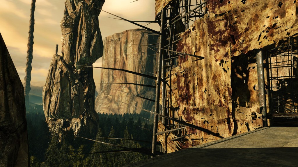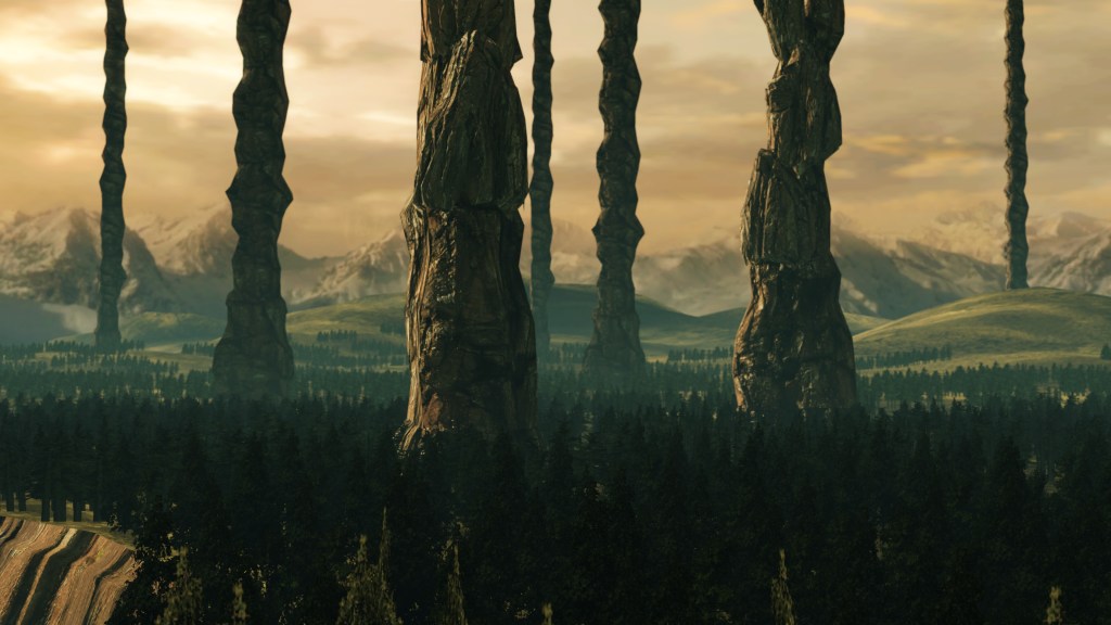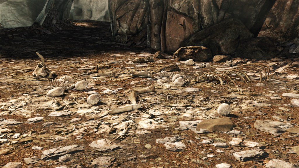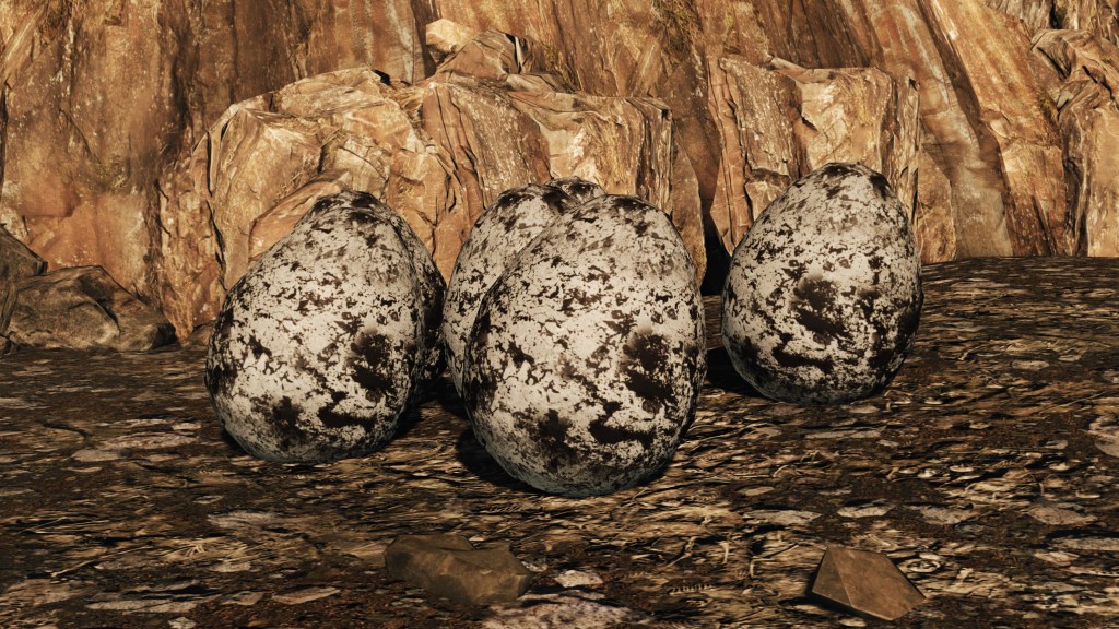Wherever a wyvern mother rests with their eggs, that stone spire is lined with a strange white substance, hard yet porous. Considering their stinger-like tails, the wyverns probably construct a byke similar to wasps, though shaped more like a bird’s nest. With both in mind, the material might be a mix of wood fibers and saliva, which explains why the explorable spire-tops are clear of trees in contrast to the surrounding formations; alternatively, rather than dried spit, it is a kind of fossilized excrement, such as the guano deposits produced by birds and bats. Either way, wyverns chew up the foliage with their powerful jaws and mark their territory with the excretion. As the Ring of the Evil Eye we can loot implies, the slumbering mothers are always watching their young, ready to turn hostile the moment we bring too many eggs harm. Fathers soaring overhead are also enraged, destroying the bridge to the shrine as egg-breakers cross. The white markings thereby serve as a warning to anyone who might think to intrude.