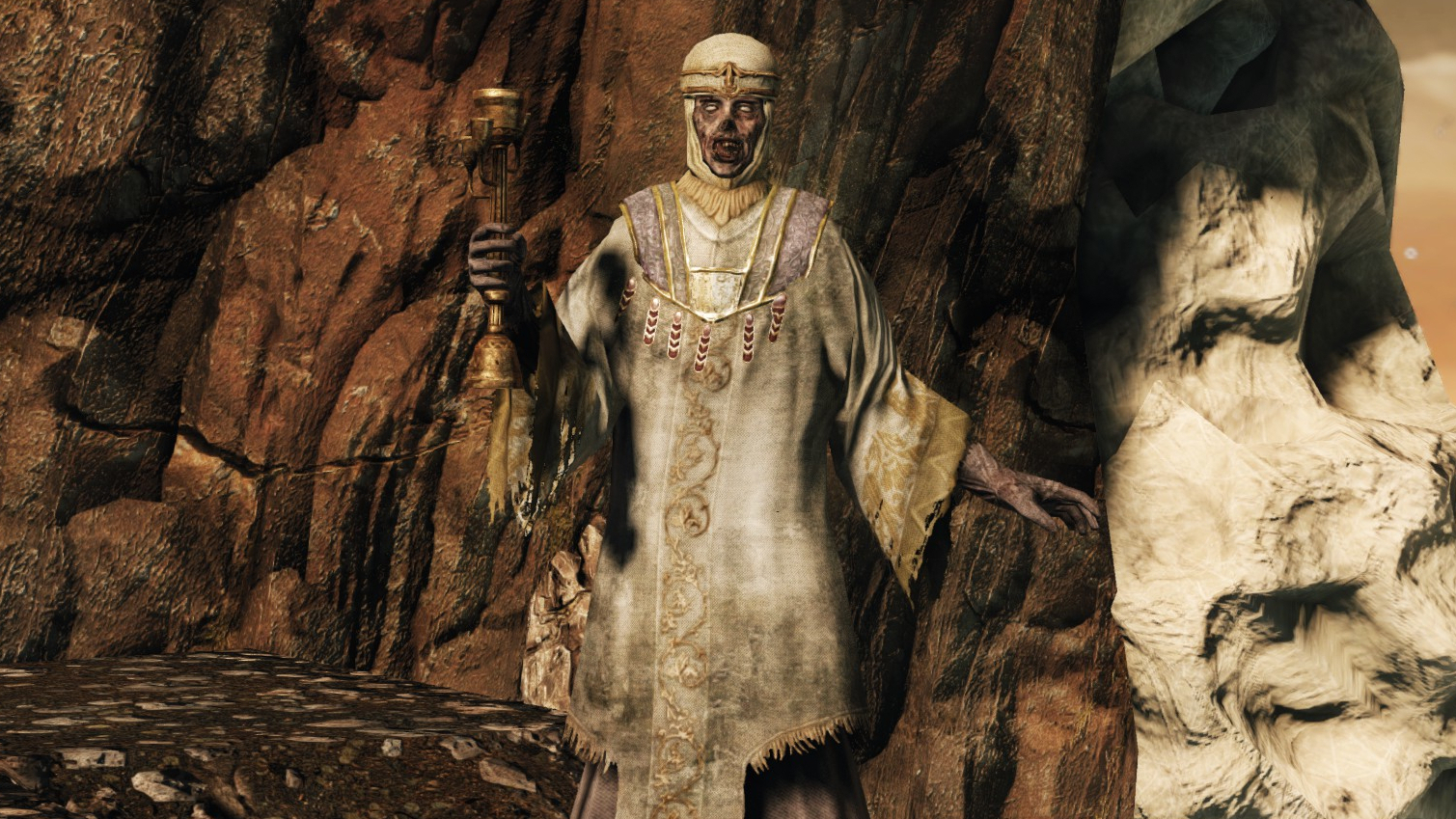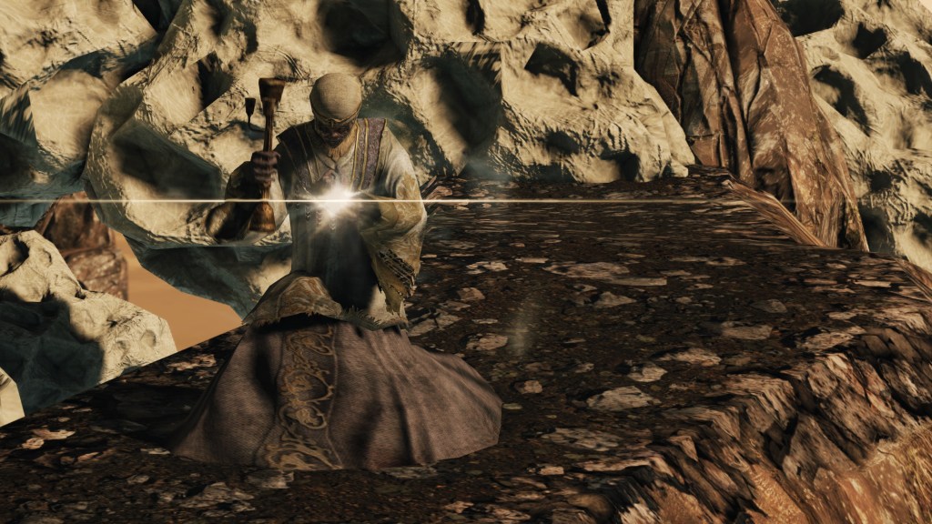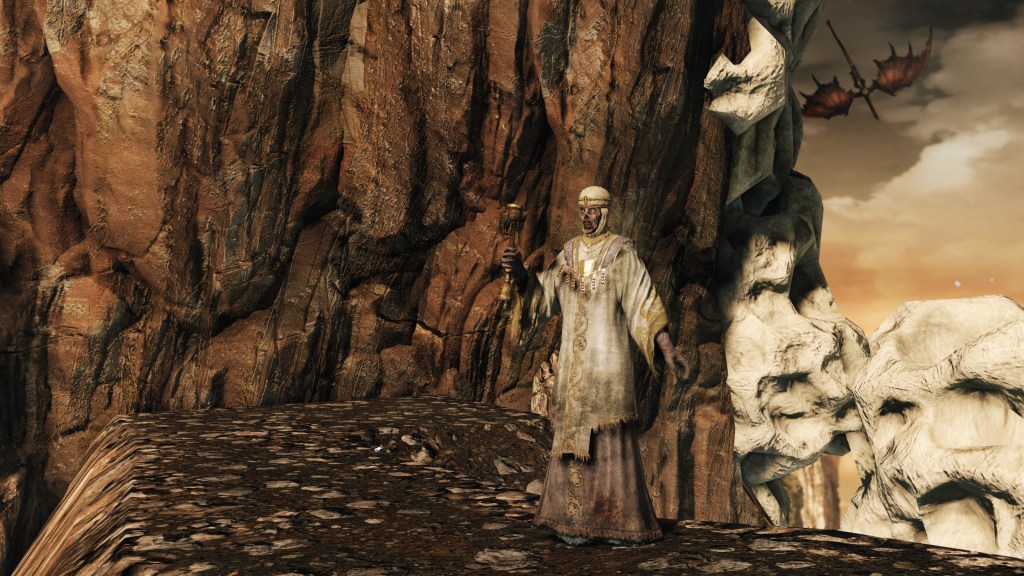 The only exception looks to be Transcendent Edde. As the name “transcendent one Edila”. (超越者エディラ) alludes, he has achieved partial draconification like the other Dragon Remnants and even wields the same Black Dragon Greatsword and Shield as Villard. All of this would imply that he originates from the Dragon Shrine, yet we find him with a summon sign just before Sinh in Shulva. More than likely, Edde wants to test his mettle against another archdragon, thereby getting a sense of how far he has come and still needs to go. Considering that the worshipers don’t seem to care if their god is killed or their egg is stolen so long as the person proved their worth in the trials, he must legitimately revere and respect the Ancient Dragon — or at least not want to be deemed a coward for making use of summoning for aid. So, where is a transcendent former man to find another stone immortal? In Shulva, where the tales of the Archdrake Sect taught at the shrine can ultimately be traced back to.