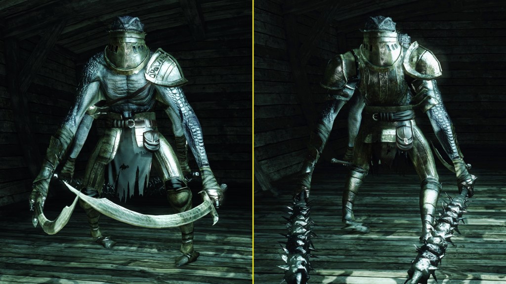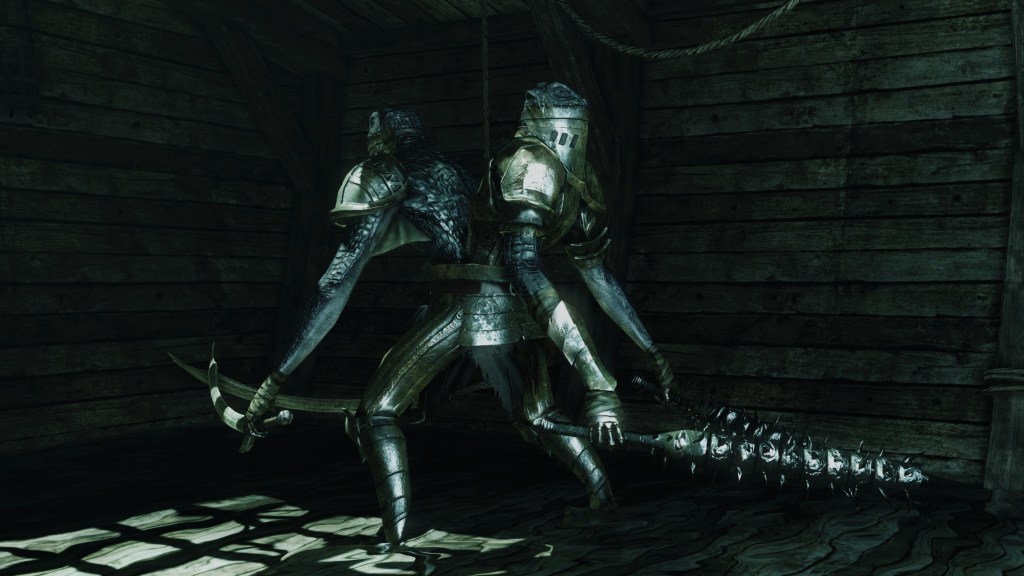 Human-to-dragon experiments was probably the origin for the Flexile Sentry as well. This “enforcer of exile” (流罪の執行者) ruthlessly executed the king’s commands to send Undead out to sea, whether their final destination be prison or a watery grave. Armed with curved swords and spiked clubs, the armored watchman always enforced its captive’s punishment with brutality. This twisted nature reflected its “grotesque” form, which the description to their similarly warped straight sword implies was the result of something doing the twisting. The boss is conjoined lizardmen, the two upper bodies acting in perfect sync despite sharing only one pair of legs. Thus, they too must have been humans transformed into a single draconic entity. The sentry’s affiliation with Aldia is obvious from the location. Besides the hull of a prison ship at No-Man’s Wharf, we find another sentry operating out of Sinner’s Rise, with yet more sealed in an ice cave at Eleum Loyce. Without a doubt, these were more failed experiments which Aldia relegated to muscle for the various endeavors he participated in.