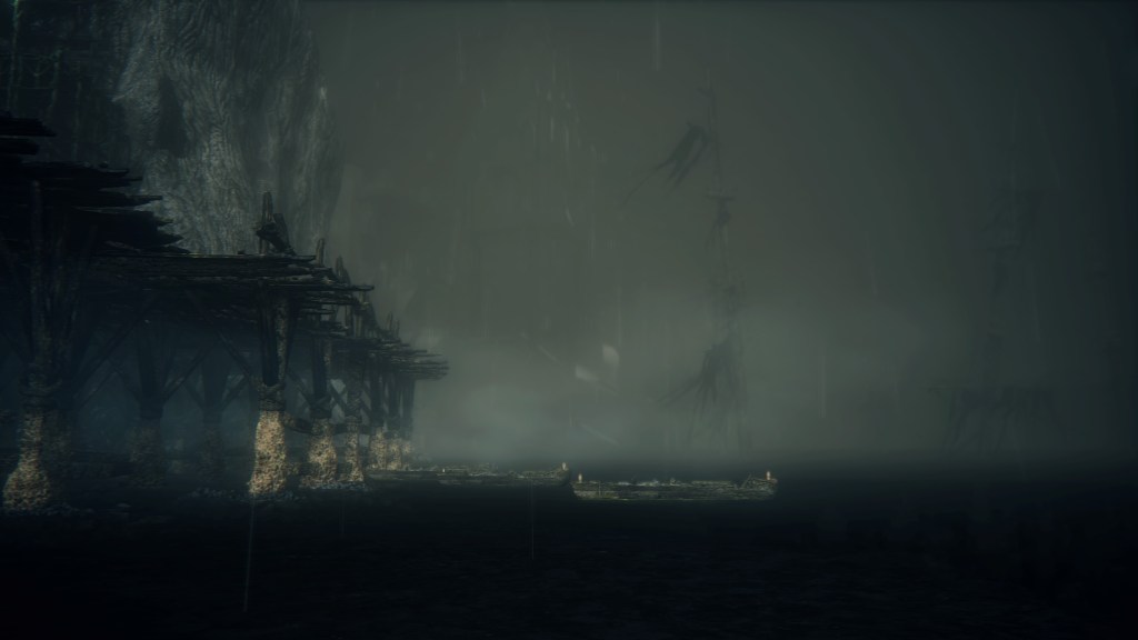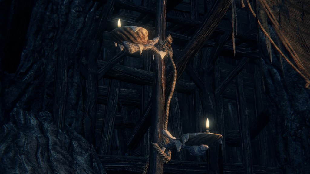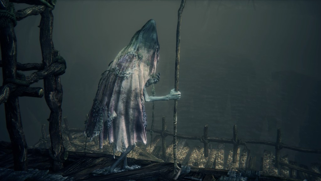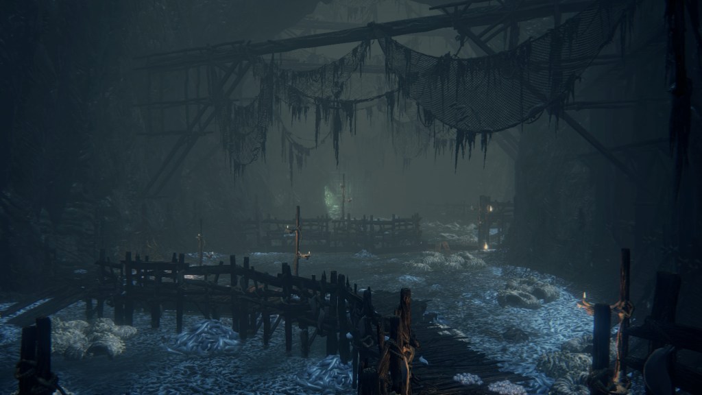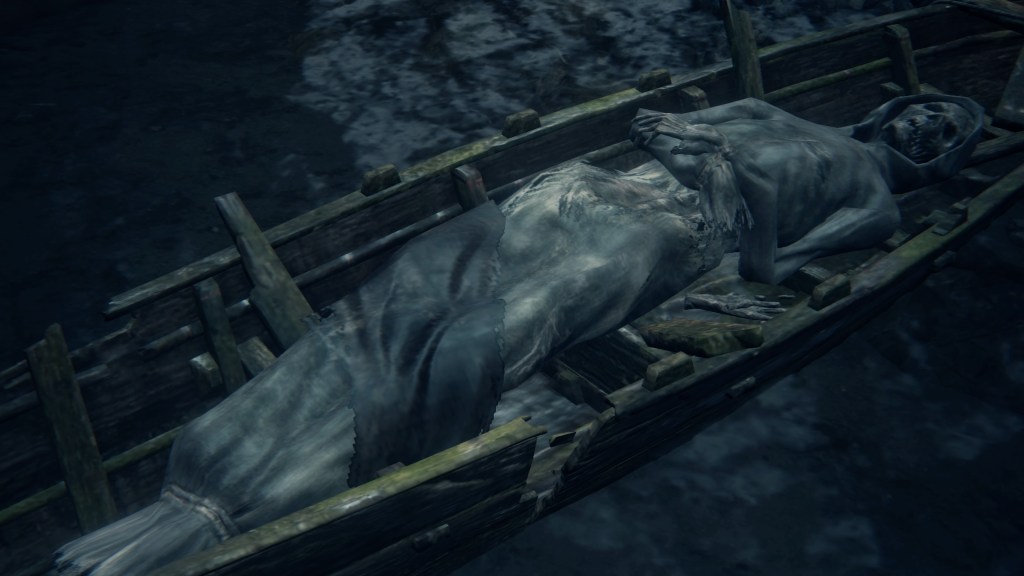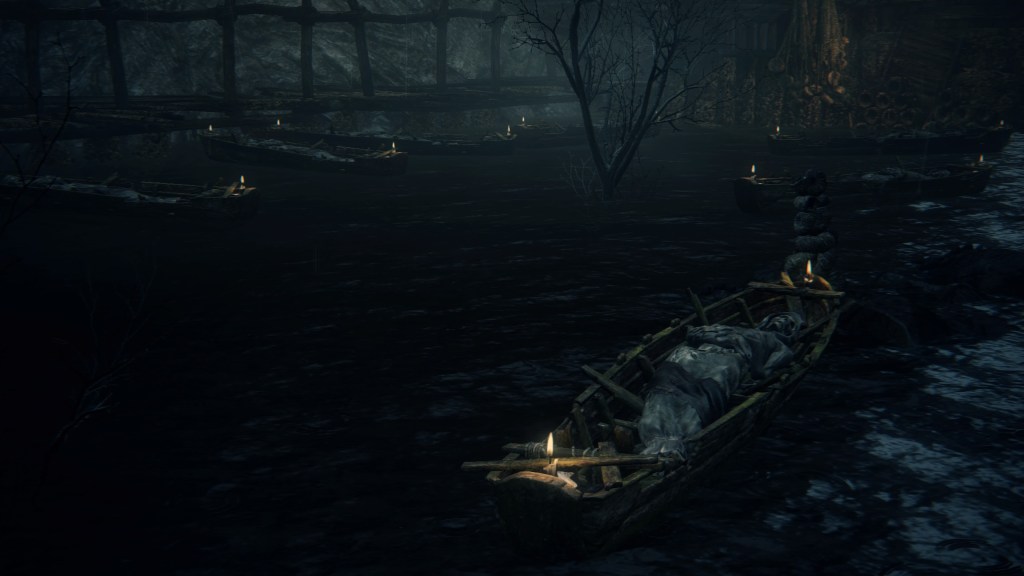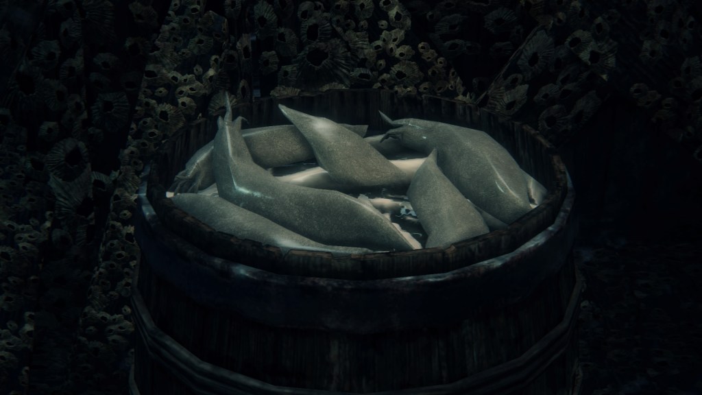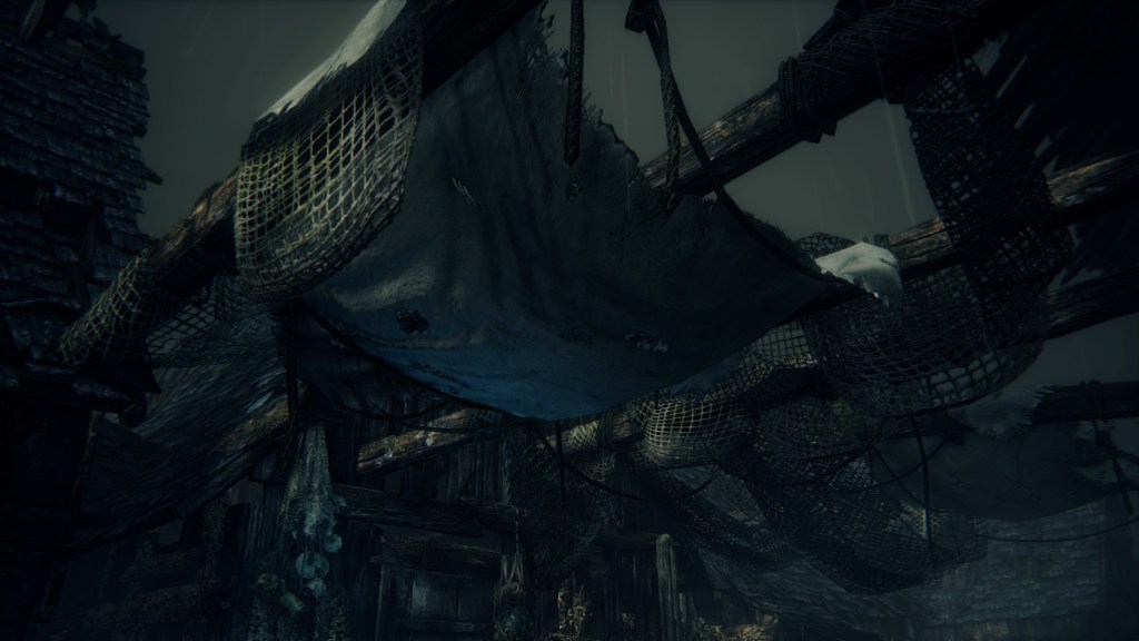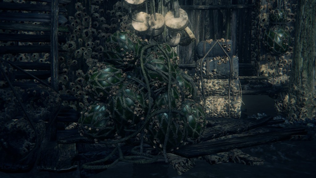With not even a known name to add nuance, the Fishing Hamlet seems to have been exactly that: your typical “fishing village”. (漁村) Shipwrecks at sea, a lighthouse on the tallest peak to lead those ships back to dock, shallow waters for dingies in town, nets to haul in catches; everything revolves around a marine diet. Naturally, this maritime culture has heavily shaped the village in other aspects. Upon first entering the hamlet, we pass corpses in candlelit dingies and rock cairns along the shallows, burial practices associated with seafaring societies. Based on the robed priest hobbling through with a skull to share, this was their “graveyard”, returning the dead to the waters they worked and leaving a marker to their memory. Much like Yharnam, this was a small but close-knit community subsisting on their own labor and insular in their ways, far enough removed from the wider world to preserve those traditions.