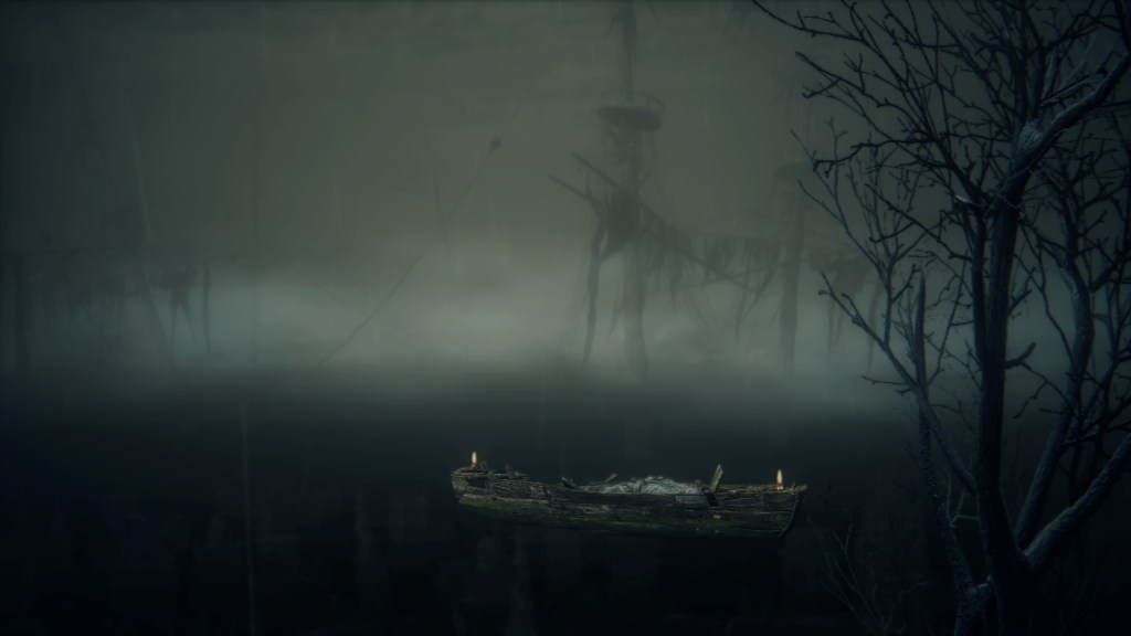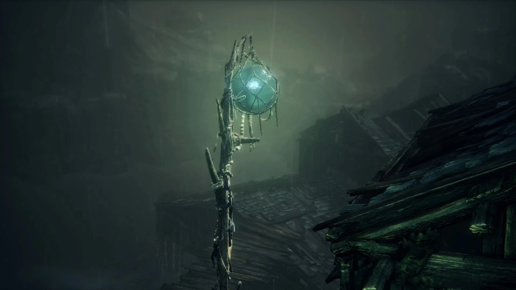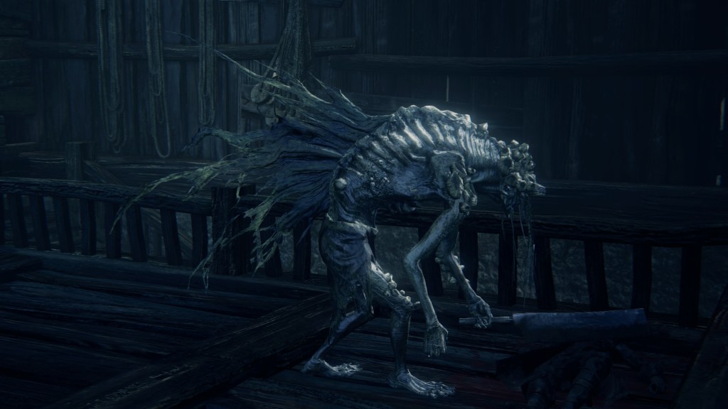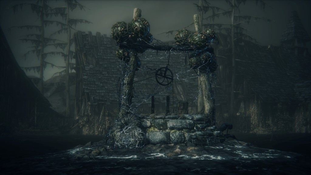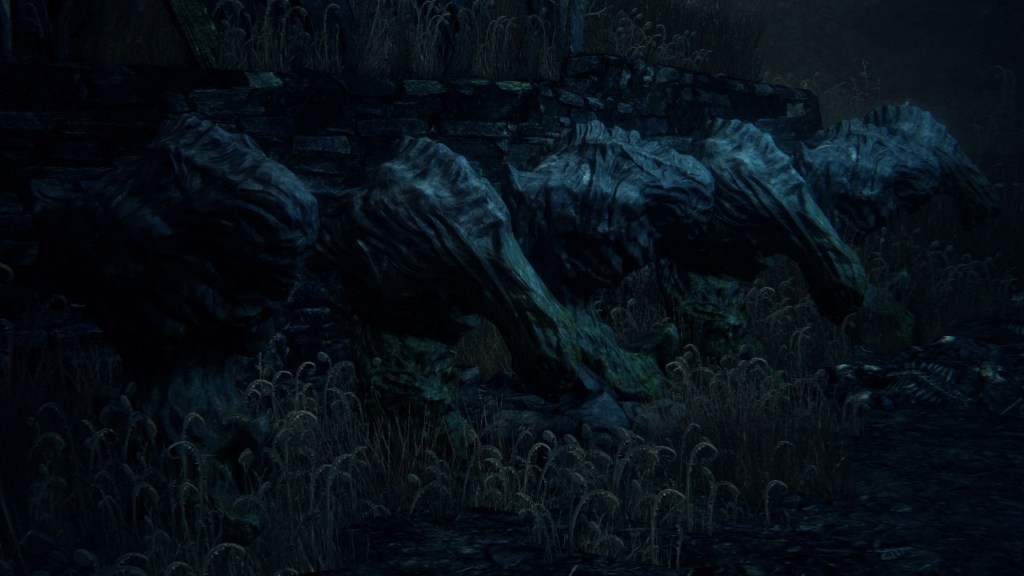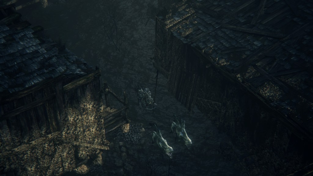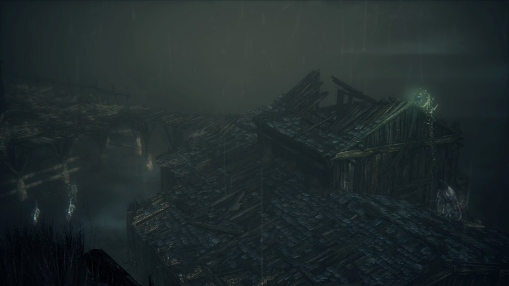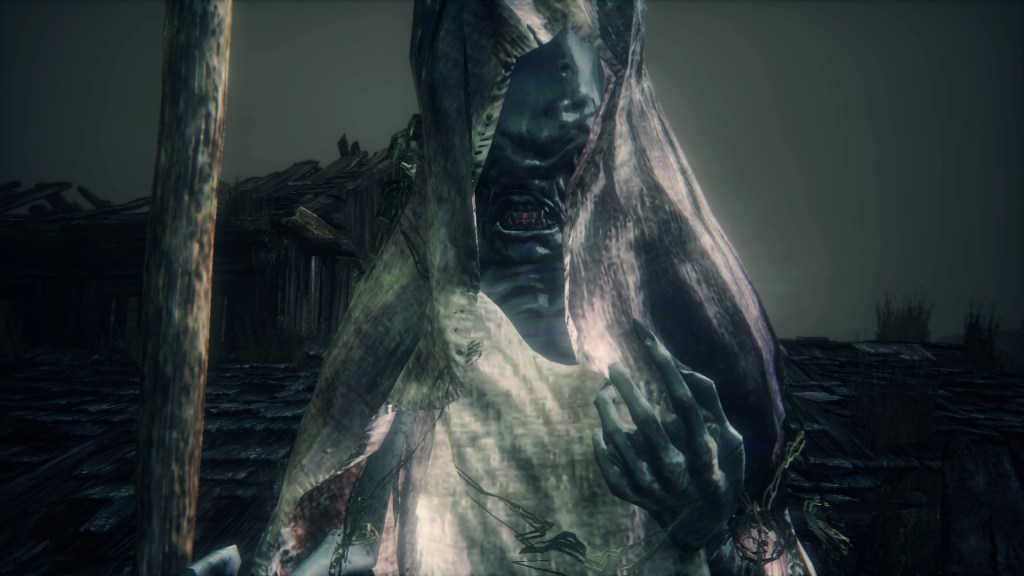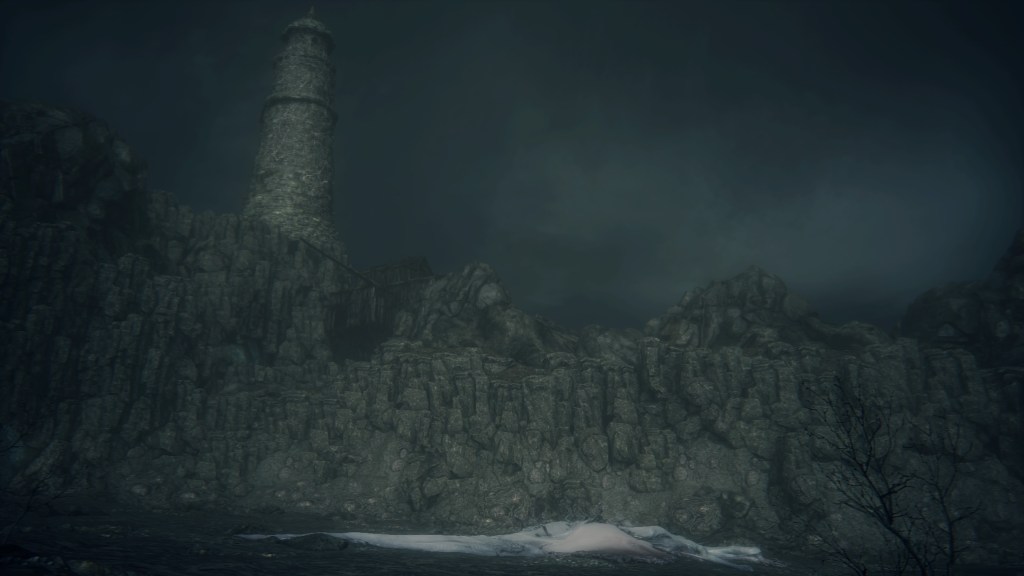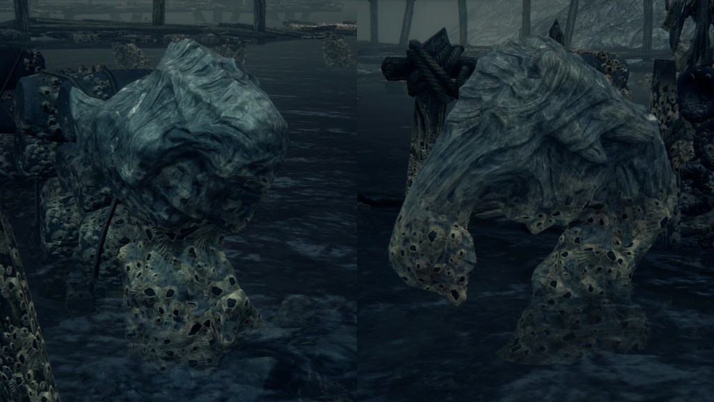 With not even a known name to add nuance, the Fishing Hamlet seems to have been exactly that: your typical “fishing village”. (漁村) Shipwrecks at sea, a lighthouse on the tallest peak to lead those ships back to dock, shallow waters for dingies in town, nets to haul in catches; everything revolves around a marine diet. Naturally, this maritime culture has heavily shaped the village in other aspects. Upon first entering the hamlet, we pass corpses in candlelit dingies and rock cairns along the shallows, burial practices associated with seafaring societies. Based on the robed priest hobbling through with a skull to share, this was their “graveyard”, returning the dead to the waters they worked and leaving a marker to their memory. Much like Yharnam, this was a small but close-knit community subsisting on their own labor and insular in their ways, far enough removed from the wider world to preserve those traditions.