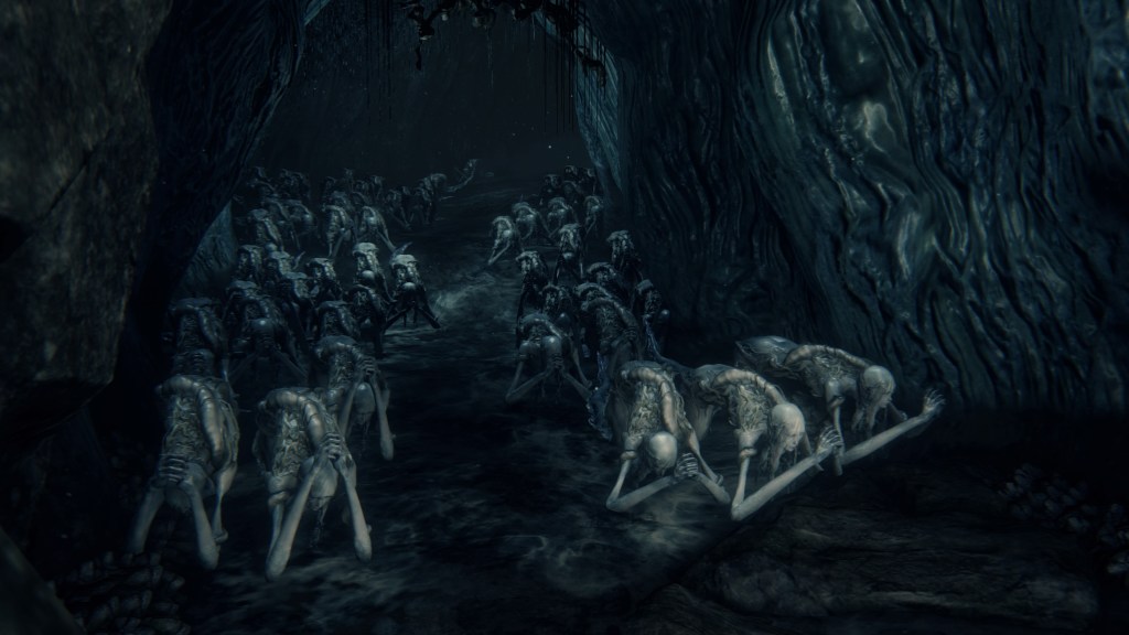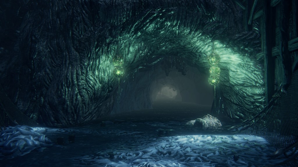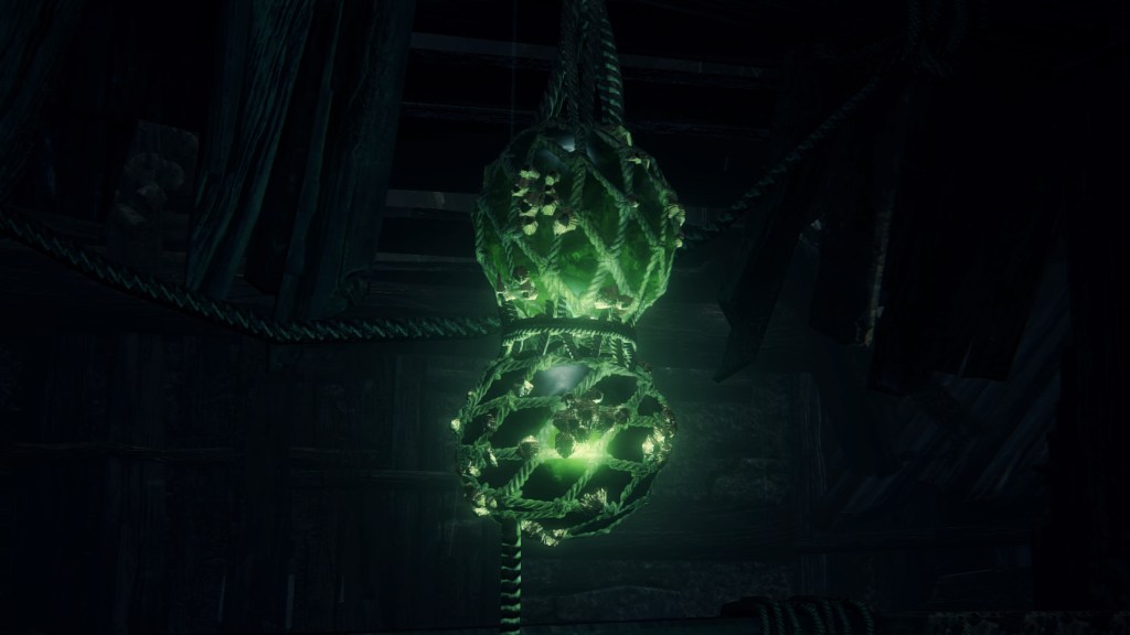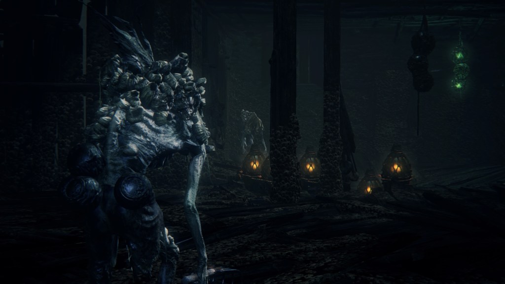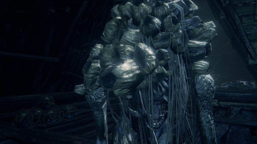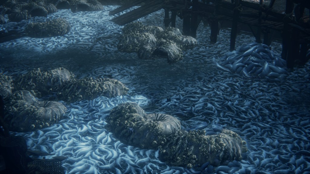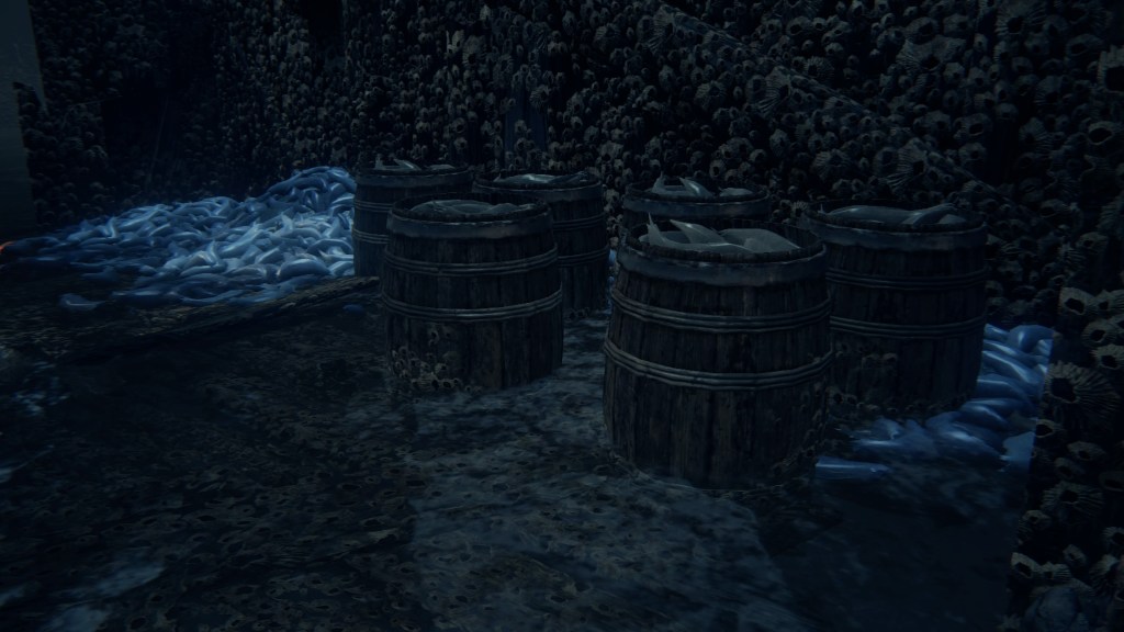 The largest building in the village seems to farm phantasms, overflowing with the glowing white mollusks and their pearly eggs — to the point that some are even lit as candles. The women of the village have turned into their own mollusks with shells to match. These shells, with and without their snail woman, are scattered all around the building, with the men commonly searching for something among the empty ones. The women do clearly pump something into us from their shell end should their jaws dig into our necks. And where do most of these shelled women hide except at the bottom where the phantasms have piled up, with many more shell-less in the adjoining caverns to Kos. They appear to owe the Great One their form, birthing phantasms for the village to harvest — and ingest. The mollusks have been distributed throughout the village in barrels. Meanwhile, tiny insect-like phantasms crawl all over headless corpses in the hamlet, which correspond to the grotesque residents’ severed heads identified in the Accursed Brew’s description. Put simply, the harvested phantasms were probably part of their diet.