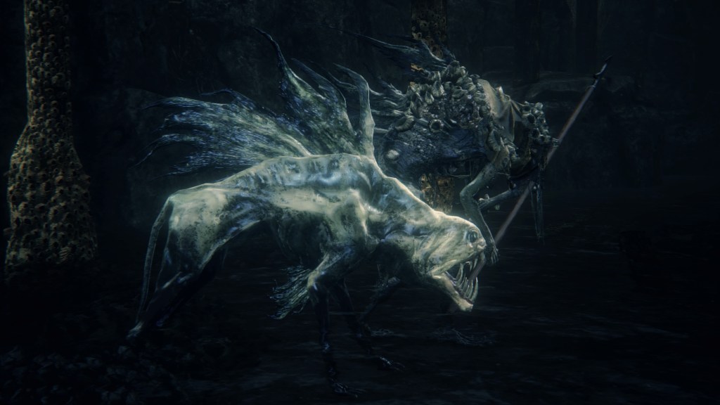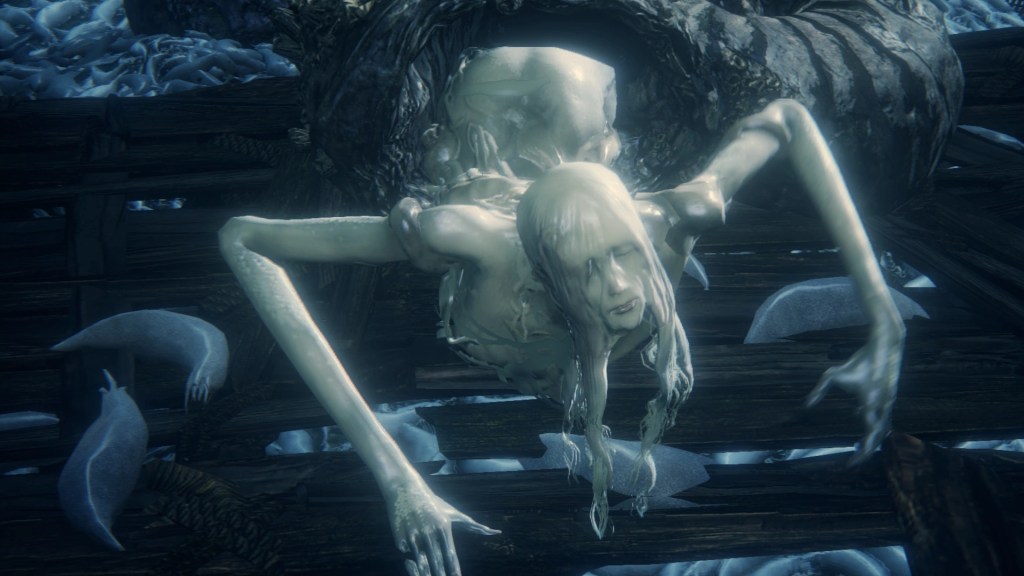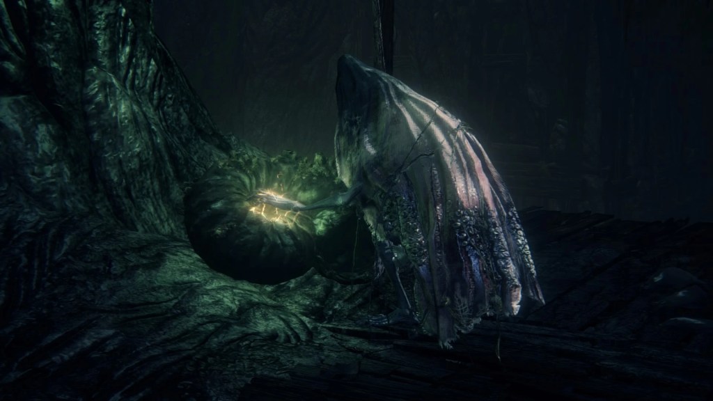 In all likelihood, Kos approached the hamlet to work out a deal. The village may have been self-sufficient, but their way of life was inherently risky. If there wasn’t a good catch that season for whatever reason, that meant famine. The Great One brought them a consistent food supply so they could focus on their whaling, something which she could also guarantee would always be viable. This would certainly be enticing to simple villagers and warrant their veneration of her for generations to come. But what would Kos get in return? To answer, we need only look at her later pregnancy. Like most Great Ones, Kos was interested in having a child, which she couldn’t do on her own. And given her only known association is the Fishing Hamlet, she must have found her mate from amongst the villagers. But just as the Pthumerians prove difficulty bearing a Great One’s child, the hamlet shows difficulty impregnating a Great One. Rather than any time earlier, it is only after generations of metamorphosis that some man gave Kos child. Therefore, that gradual transformation is likely what made that possible.