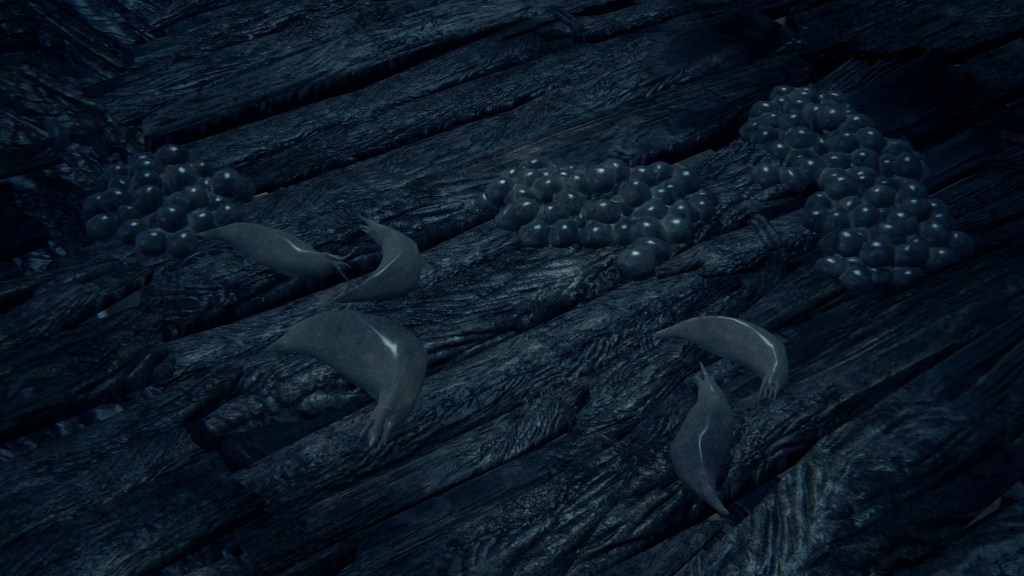 The hamlet worships the Great One, priests invoking her name whilst casting arcane arts and other residents praying toward her. Her body likewise lies on the shore just outside the hamlet. Because of this and the Kos Parasite’s description of the carcass having “washed up on the coast”, many infer that the Great One became like a beached whale who the yokels then began to worship. True, it may be that the village’s faith was inspired by Japan’s historical whale worship. But the Japanese description for the parasite actually claims Kos’ corpse to have been “abandoned” on the seashore, meaning that she had already come onto land when she was seemingly killed and left to rot; the villagers’ dialogue likewise indicate that she was already being venerated when slain. In other words, Kos must have just been residing in the local waters where she crossed paths with the villagers in the course of their work. This makes her physically influencing the local wildlife they whaled more than feasible.