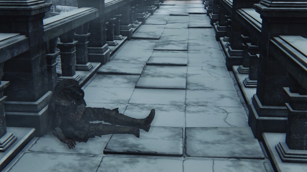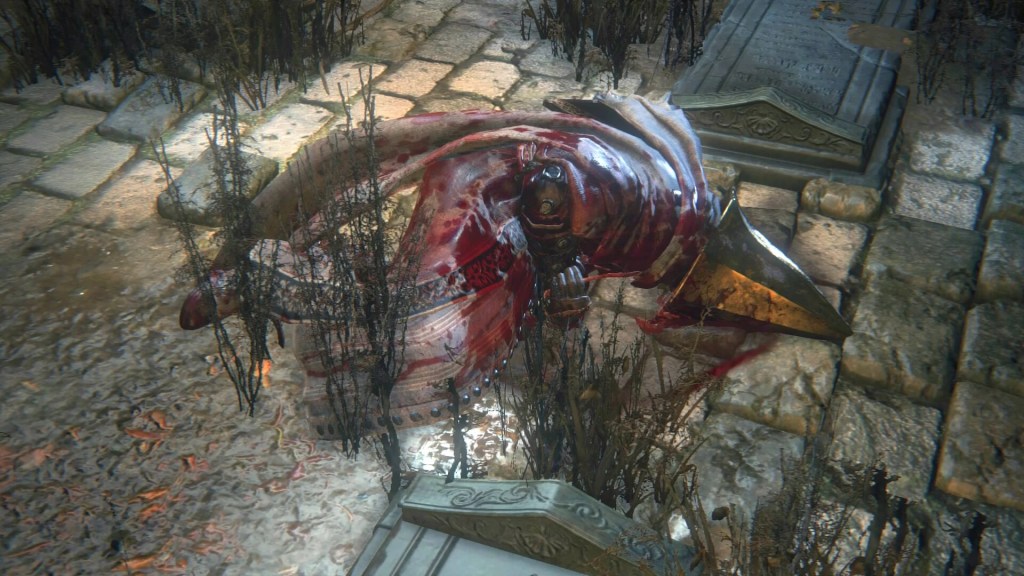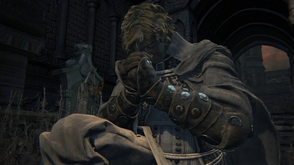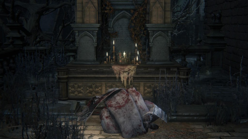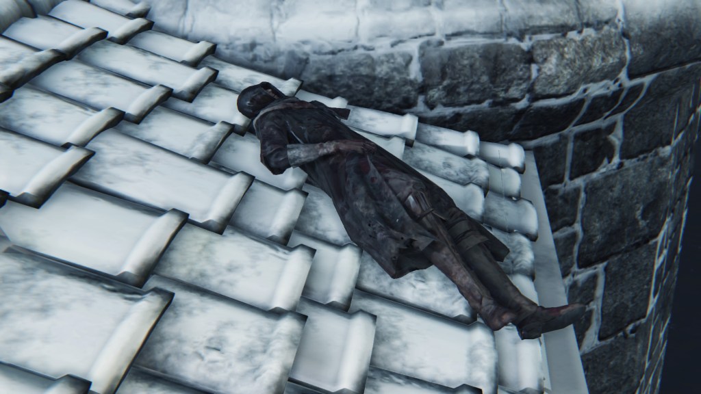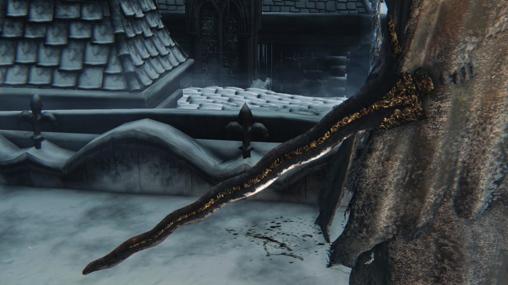 Indeed, we can only find a handful of corpses with items associating them with Executioners. Those able to fight didn’t have the strength or numbers to drive back the invaders, and once they were cut down, the rest were easy pickings. It didn’t matter whether the nobles hid outside along the walls and flying buttresses or inside behind tables and bookcases. In the end, they were all found and killed. One exception seems to be Arianna. The prostitute wears the fashion of nobles from the “end” of the Cainhurst bloodline, so the dress is unlikely to be a hand-me-down from a past generation who moved to Yharnam. If she is a noblewoman of Cainhurst, then she must have escaped during the chaos and fled the castle. But the fact that she is the only known survivor amongst the nobility speaks to how thoroughly the Executioners did their work. Even the mausoleum leading to the Pthumerian ruins was reduced to rubble, ensuring no one would make use of the entombed nobles’ blood; it also, perhaps unwittingly, blocked blood hunters in the labyrinth like Leo from finding their way back.