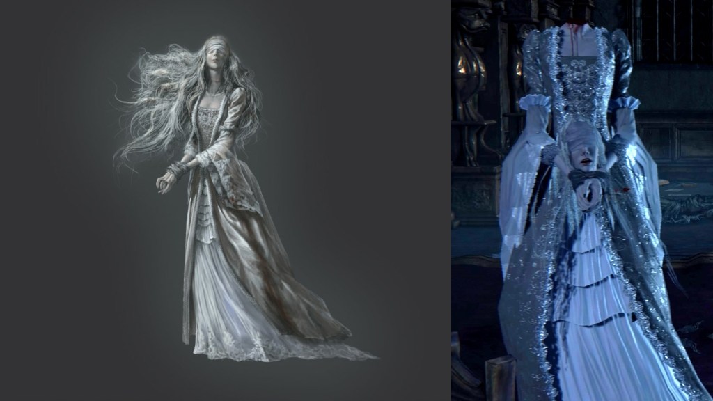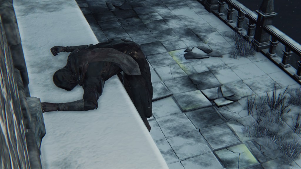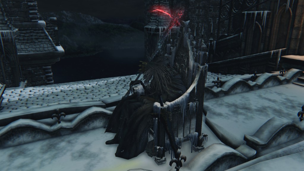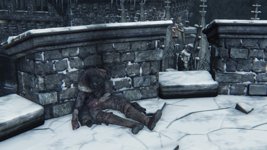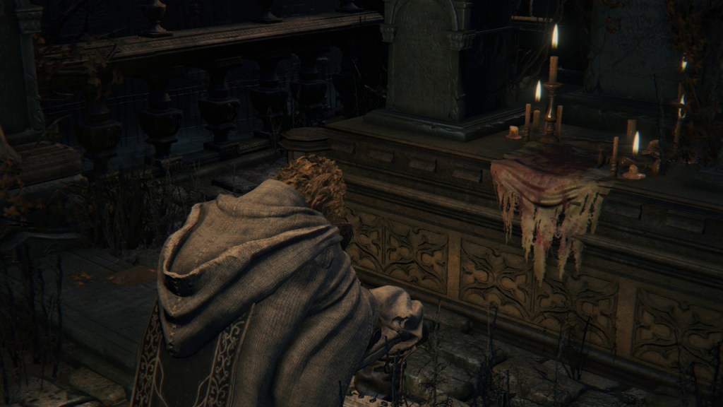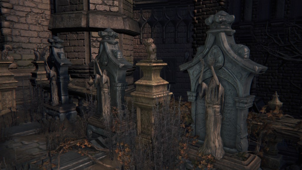 Indeed, we can only find a handful of corpses with items associating them with Executioners. Those able to fight didn’t have the strength or numbers to drive back the invaders, and once they were cut down, the rest were easy pickings. It didn’t matter whether the nobles hid outside along the walls and flying buttresses or inside behind tables and bookcases. In the end, they were all found and killed. One exception seems to be Arianna. The prostitute wears the fashion of nobles from the “end” of the Cainhurst bloodline, so the dress is unlikely to be a hand-me-down from a past generation who moved to Yharnam. If she is a noblewoman of Cainhurst, then she must have escaped during the chaos and fled the castle. But the fact that she is the only known survivor amongst the nobility speaks to how thoroughly the Executioners did their work. Even the mausoleum leading to the Pthumerian ruins was reduced to rubble, ensuring no one would make use of the entombed nobles’ blood; it also, perhaps unwittingly, blocked blood hunters in the labyrinth like Leo from finding their way back.