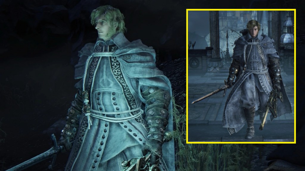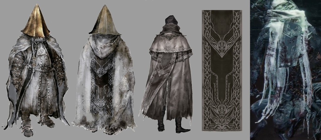 This sequence of events has led to some confusion among fans since the Executioner uniform serves as the basis for later church attire. How can this description from their equipment be accurate when the first church hunters were Ludwig and his Holy Blades? Moreover, church attire is supposed to be borrowing heavily from the Byrgenwerth uniform. But none of these statements are mutually exclusive. We do see a strong influence from the student uniform, clergy wearing some combination of layered long clothing, thick capes, or waistcoats. This includes Executioner attire, whose descriptions only ever highlights the holy cloth as a specific element carried over to subsequent church apparel. And if this apparel was based on the uniform of a group which didn’t exist until later on, then there is but one conclusion: that uniform wasn’t always theirs.