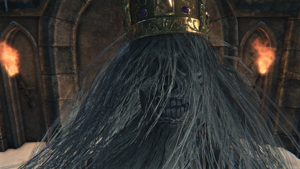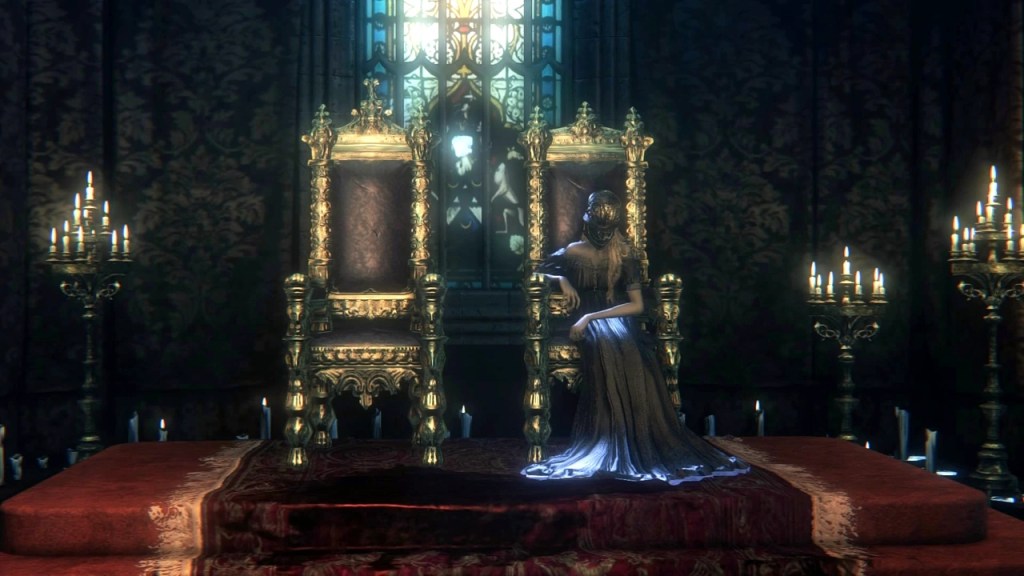 At last, Logarius and his unit reached the royal audience chamber. Ample blood stains the rug, including in front of the two thrones. Given that Logarius ends up acquiring the Crown of Illusions, it is very likely that a king was present to defend his wife along with the royal guard. However, the Executioners evidently dispensed with Annalise’s husband and saw through his trickery with their secret treasure. Deprived of all her bodyguards, the queen was at their mercy. Only one problem: she doesn’t die. From Alfred’s dialogue, Logarius and crew realized that Annalise’s flesh was immortal, meaning that they couldn’t simply bash or shred her as they had with her clansmen. Even if they destroyed the whole castle and razed the rubble, she would remain; her corrupted blood would always exist to contaminate holy radiance. Naturally, this put a huge damper on their whole operation. Nothing could be done about the undead queen, yet they couldn’t leave her alone either.