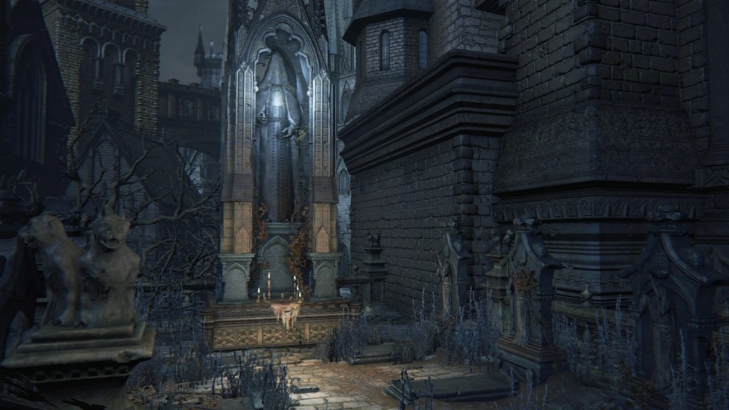 And so, the Executioners have continued their hunt from their own secret workshop, striking at the corruption wherever it be found. We first find Alfred praying before a bloodied cloth laying upon Logarius’ grave, ornamented like an altar. This suggests that offerings — namely some part of their targets’ bodies — were made to their master as proof of their success. The mausoleum can also be considered a shrine by virtue of its holiness, and in the fanatics’ minds, the martyr is still able to interact with them, even through effigies; the holy man is closest to Radiance, after all. Cribbing ideas of “guidance” from Ludwig’s Holy Blades, Logarius’ Executioners see him guiding their sacred duty to fruition through divine providence. He is a cult figure, in ways that not even his old master became postmortem. But this veneration for the martyr is still limited to his followers, the Healing Church doing nothing to promote Logarius’ cult since the initial honor. In fact, the clerics haven’t hesitated to undermine the Executioners when the need arises.