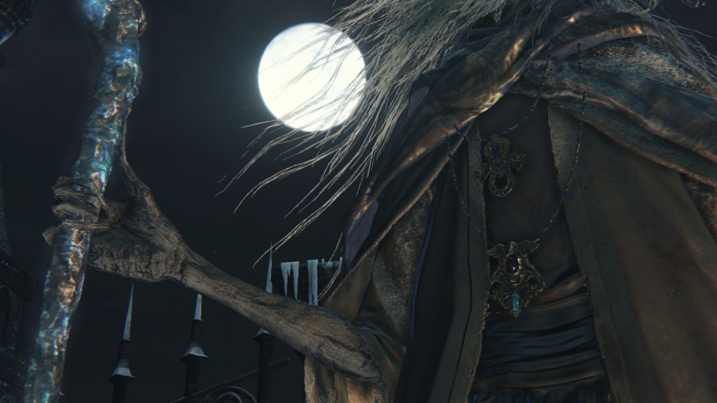 From the outset, the Executioner is perfectly amicable in cooperating with fellow hunters to exchange information on Cainhurst. A warrior of devout faith offering friendly cooperation and eventually wearing radiant headwear is an obvious reference to Dark Souls’ Solaire, the two even sharing the same voice actor. The way Alfred obsesses over Logarius almost as a surrogate father figure is also very reminiscent. But whereas Solaire saw the sun as a standard to emulate, Alfred perverts this sentiment. Logarius needs to meet his standards in order to justify the Excutioner’s adoration. The martyr can’t be this figure worthy of all this praise when he is merely containing the problem — they, his followers, have to first solve it. In short, Alfred doesn’t really love Logarius; he loves the idea of Logarius, his idea. Hunting mere beasts didn’t fit that conception of a divine mission, nonetheless he will happily help us do so if it will lead to him making his holy “father” that perfect witness of the faith. But behind the facade is a deeply disturbed mind.