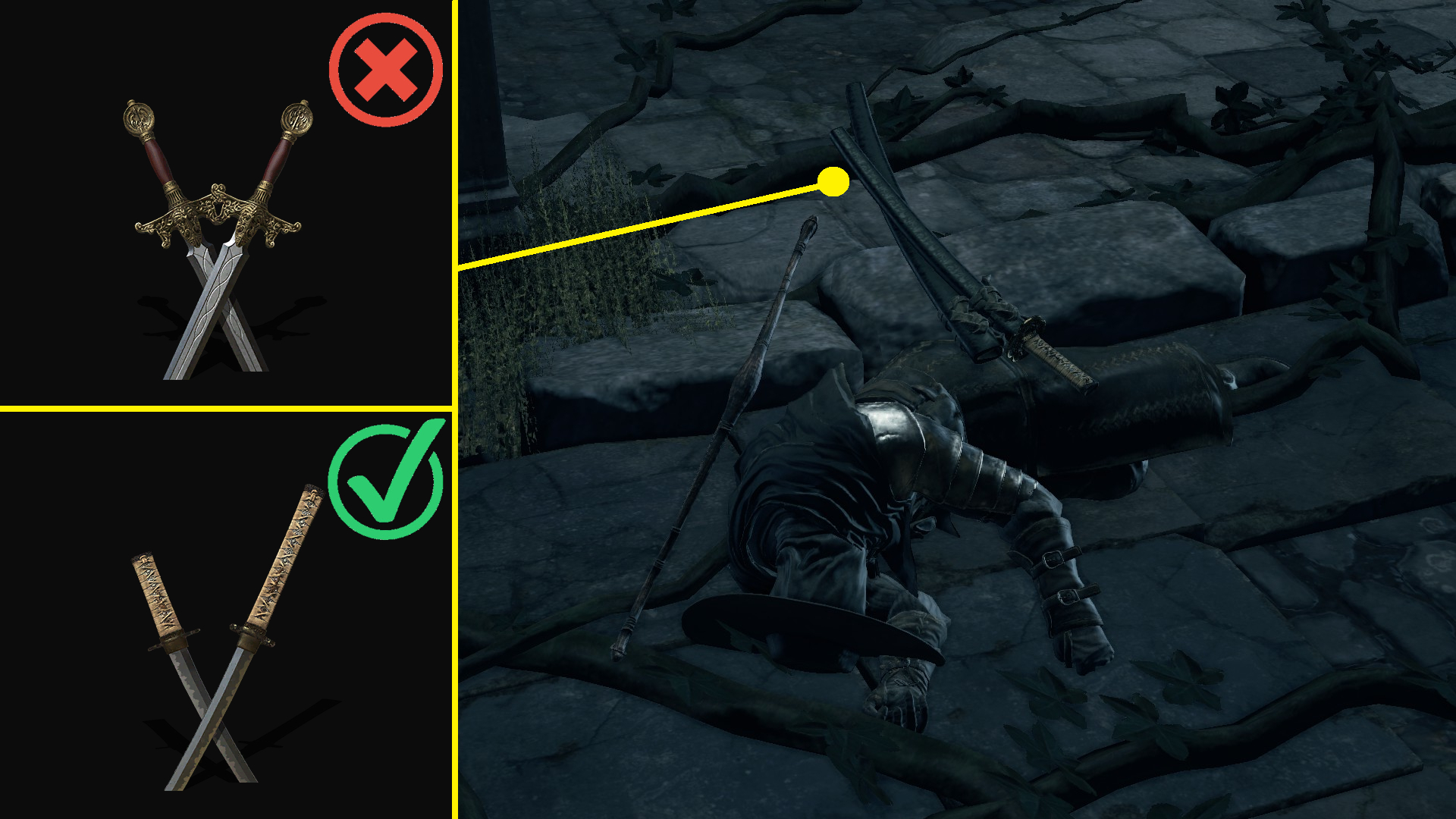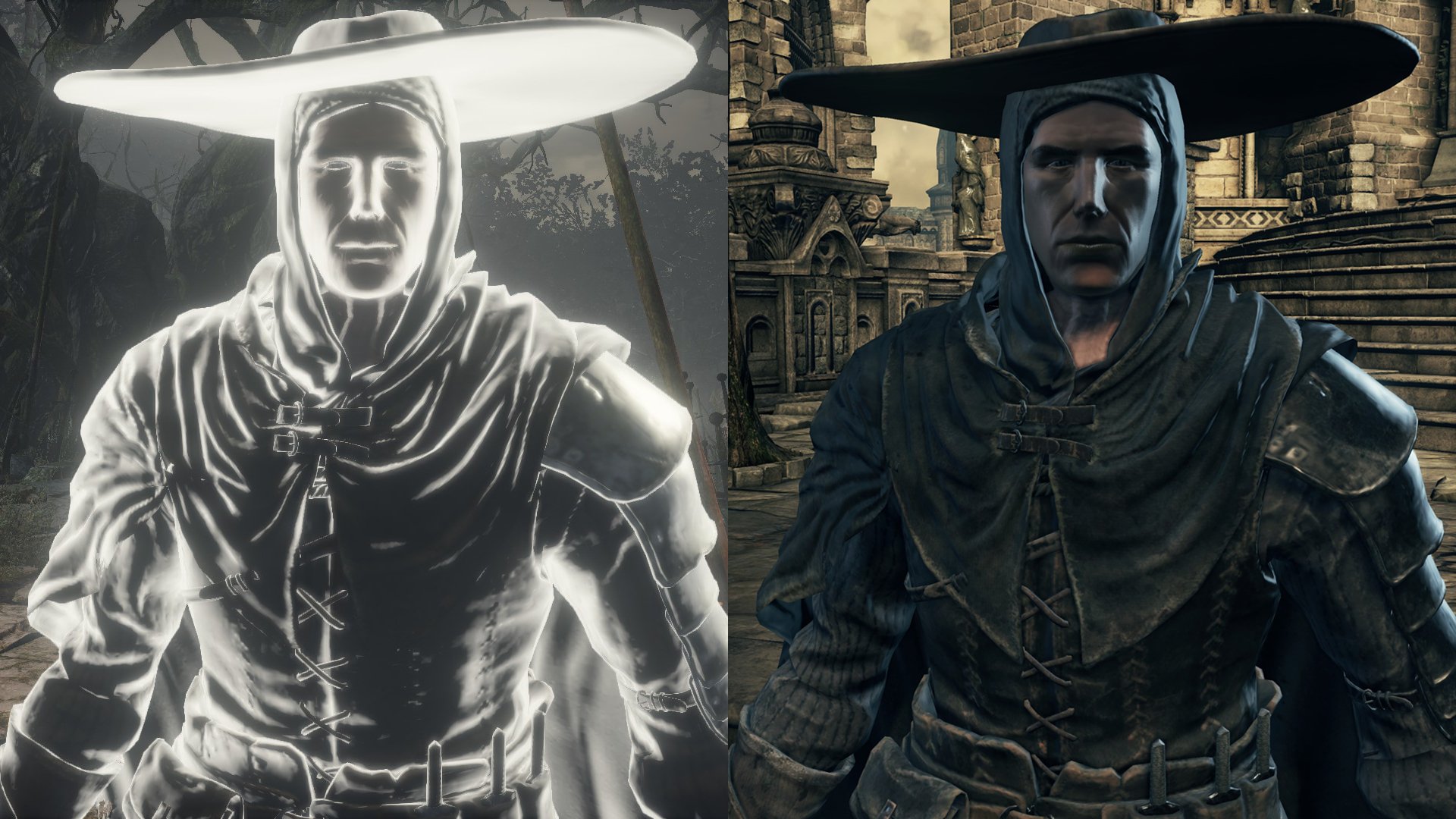 With a name related to the Japanese kami and use of katana, Kamui is quite obviously an Easterner. This might not seem as obvious looking at his facial features, lacking the long-slit eyes and small lips characteristic of the “snake foreigner face” (蛇の異人顔) by western detractors or “dragon foreigner face” (竜の異人顔) by the occasional endorser. However, this inconsistency can be attributed to him sharing a character model with Gotthard. Both members of the Black Hand are identical save for their swords — in fact, Gotthard’s corpse was erroneously left with Kamui’s weapon instead of swapping it out for his own distinctive twin blades; the developers also failed to notice that the “corpse” still blinks. This leaves little doubt that Kamui just suffers from FromSoftware recycling assets for a hostile NPC most players won’t ever get a good look at. Kamui proves to be more than just a clone of Gotthard.