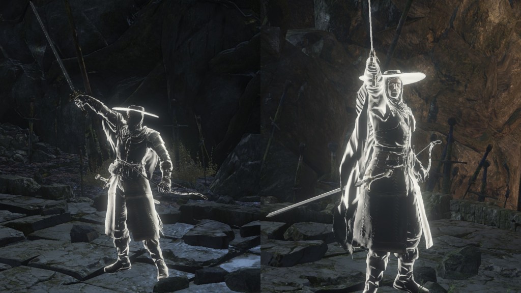 Even so, this still wouldn’t explain why the king went to the effort to hire Kamui when he had at least two existing hunters able to take on the unseemly task. Perhaps this particular job was too dirty to entrust to the traditional hunter. Gotthard was singled out from among the knights, and the same was liable to be true for his unnamed comrade. And at least in the case of the former, that chivalric spirit carried over into his work as a hunter. Upon being summoned as a phantom, Gotthard immediately raises his sword like a musketeer, as if vowing on his honor as a knight — embodied in that blade — to help us achieve victory against the boss ahead. His individual handling of Sulyvahn and Gertrude likewise betray his desire for a strong, faithful, but independent Lothric. This isn’t the behavior of a man who performs his assassinations without pride and patriotism. He is a Black Hand because his loyalty is to his country, not any one of its kings.