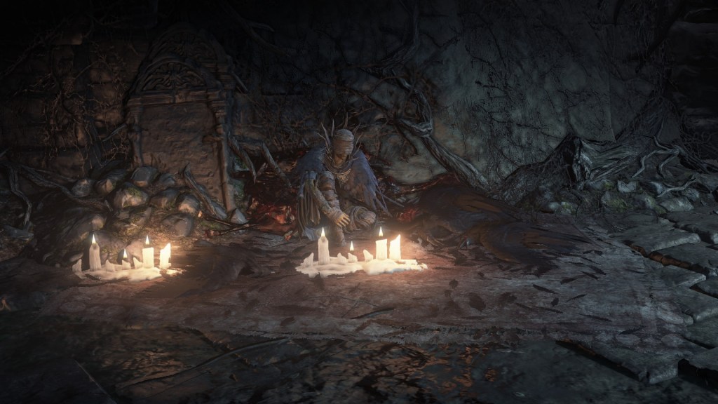But as the ash description also acknowledges, we give the frail elder the opportunity to take on one final apprentice. A chance encounter with unkindled ash, a vessel for flame as he puts it, sparks his curiosity as a teacher for imparting flame. He is thus more than happy to welcome us into the world of pyromancy; he even gets to see the bonfire he had only heard about in stories up until that point. This scenario, of course, is only at our discretion, but Cornyx proves to be a rocksteady ally between not leaving the shrine and not somehow using our training for his own ends. He simply takes us under his wing and stands by. Even if he longs to learn more pyromancy, teaching has always been his true calling, and that keeps him perfectly fulfilled. The same cannot be said for others.
