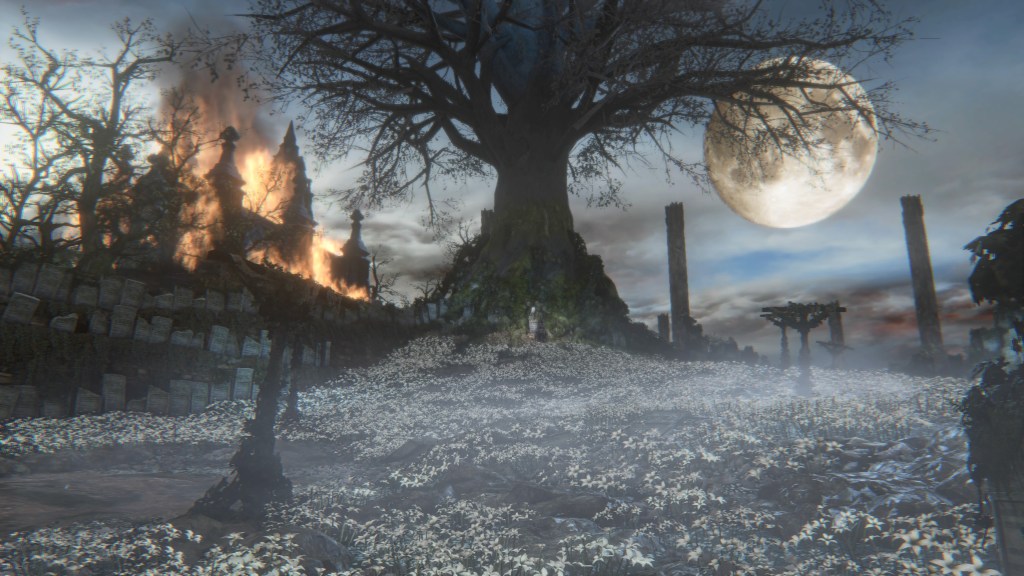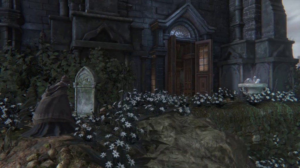 Her retribution doesn’t end there. The patients indicate that she hasn’t gone to comfort them, their desperate pleas suddenly left unanswered to their confusion. It isn’t as if Maria cannot leave her chamber. The Fishing Hamlet in the nightmare has a simple grave erected on the cliff overlooking the corpse of Kos, a single star flower laid in front. Clearly, someone tried to honor the Great One’s passing, perhaps trying to bring peace to her wrathful spirit. And the only person who could have done this is gentle Maria, who has access to star flowers just outside her tower and retains the dial needed to reach this place; more are laid before the entrance to the village behind her. The lady hunter therefore either must refuse to visit her reconstituted patients or is constrained from doing so. Indeed, she makes no obvious attempt to end the curse herself despite the opportunity. If she cannot bring harm to the Orphan of Kos, then she is no less a slave than the blood-drunk hunters down below; her unique lucidity merely lets her hear the patients suffer while she can only stand by, without giving them even the small modicum of comfort she did in life. Maria went from one hell to another.