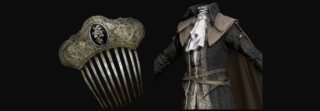 We can loot the Small Hair Ornament from a cabinet in the abandoned workshop. Like the doll’s clothes, this accessory too had received loving care which has lasted the test of time. And although its design best complements grey hair, it cannot be one of Maria’s belongings originally, as the description notes it to be rather modest; a contrast to the lady hunter’s workshop attire which very much maintains that garish flourish of Cainhurst. In other words, this must have been obtained or created by Gehrman. At the same time, however, it couldn’t have been for his doll. When gifted the ornament, the doll in the Hunter’s Dream is overcome with emotion. The localization has it describe feeling nostalgic yearning, reflecting an earlier draft of the game’s script. However, the Japanese dialogue in the final game instead posits this as simply joyful warmth, reframing its tearful reaction to be because the gift was the first show of affection the thing had ever received. It is obvious that this accessory is foreign to the doll, meaning that it was probably never part of its waking world counterpart’s dress-up.