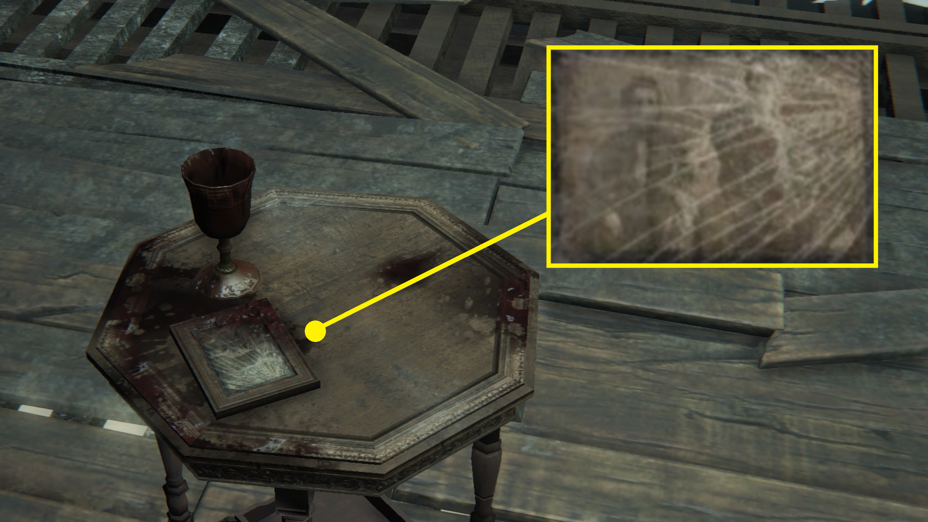 Even so, Maria continued with her duties. Because it was what her dear master wanted, and maybe, just maybe, she could reduce the excess suffering even a little. But there was little more she could do than let patients smell the flowers, hold their hands twisting in agony on their beds. Unsurprisingly, this brought her no shortage of stress. We can spy a broken framed photo on her side table. Close inspection of the photo reveals two male figures, one holding what looks vaguely like a swaddled babe. If so, then it is likely a photo of Laurence, Gehrman, and the Orphan of Kos taken for the research record, a copy handed to Maria as perhaps a reminder of what she was contributing to. In that case, it is understandable why she might glance at it while resting quietly within her own thoughts after another long day dealing with the patients, only to smash it in a fit of frustration. She was coming to hate her idol, yearning for bygone days they couldn’t go back to. And her inability to leave Gehrman pointed that hatred inward.