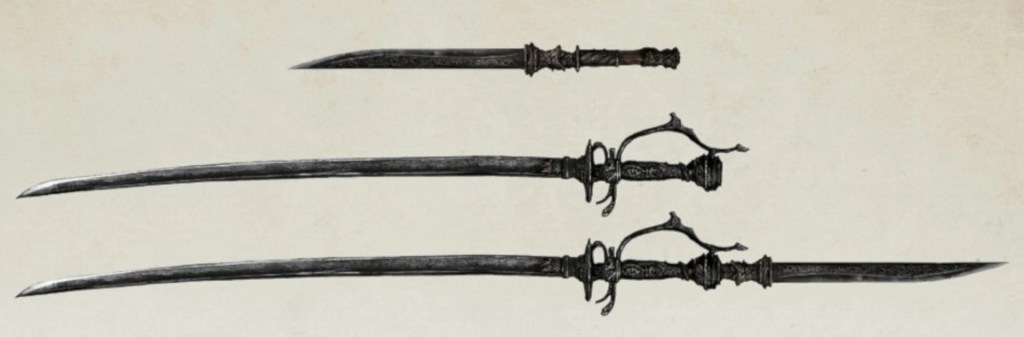 From the very start, Maria was the odd one out. Her close relation to the Queen compared to most in Cainhurst may have made her enhanced physical abilities possible, but this wunderkind never fully embraced her blood’s potential. Her choice of weapon was Rakuyo, an Eastern sword like the Chikage but not wholly reliant on the use of blood blades for an edge in battle. Instead, it was a “crammed” katana (仕込み刀) in the same vein that the threaded cane is a “crammed” cane, (仕込み杖) the individual short and long swords jammed together at the hilt to form a kind of twin blade; its trick was thus separating the two to dual wield. It is an ingenious invention by Easterners, samurai in feudal Japan commonly wielding both swords for combat. Maybe the added mechanism is for a cabinet piece to attract collectors of a bygone age, like the Cain clan. Still, it allows for another option in battle. Even if the imbalanced weight distribution made the combined form unwieldy, requiring the most skill of any trick weapon, it risked drawing none but the enemy’s blood.